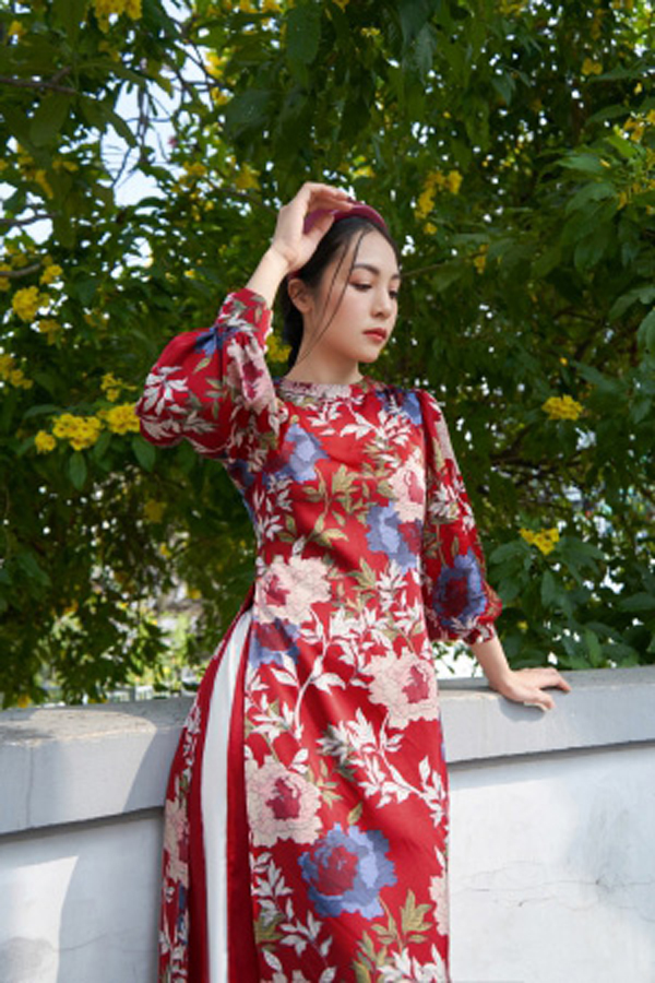 áo dài đỏ form suong may chất liệu lụa gấm kết hoa sen, tay lỡ loe, quần lụa trắng