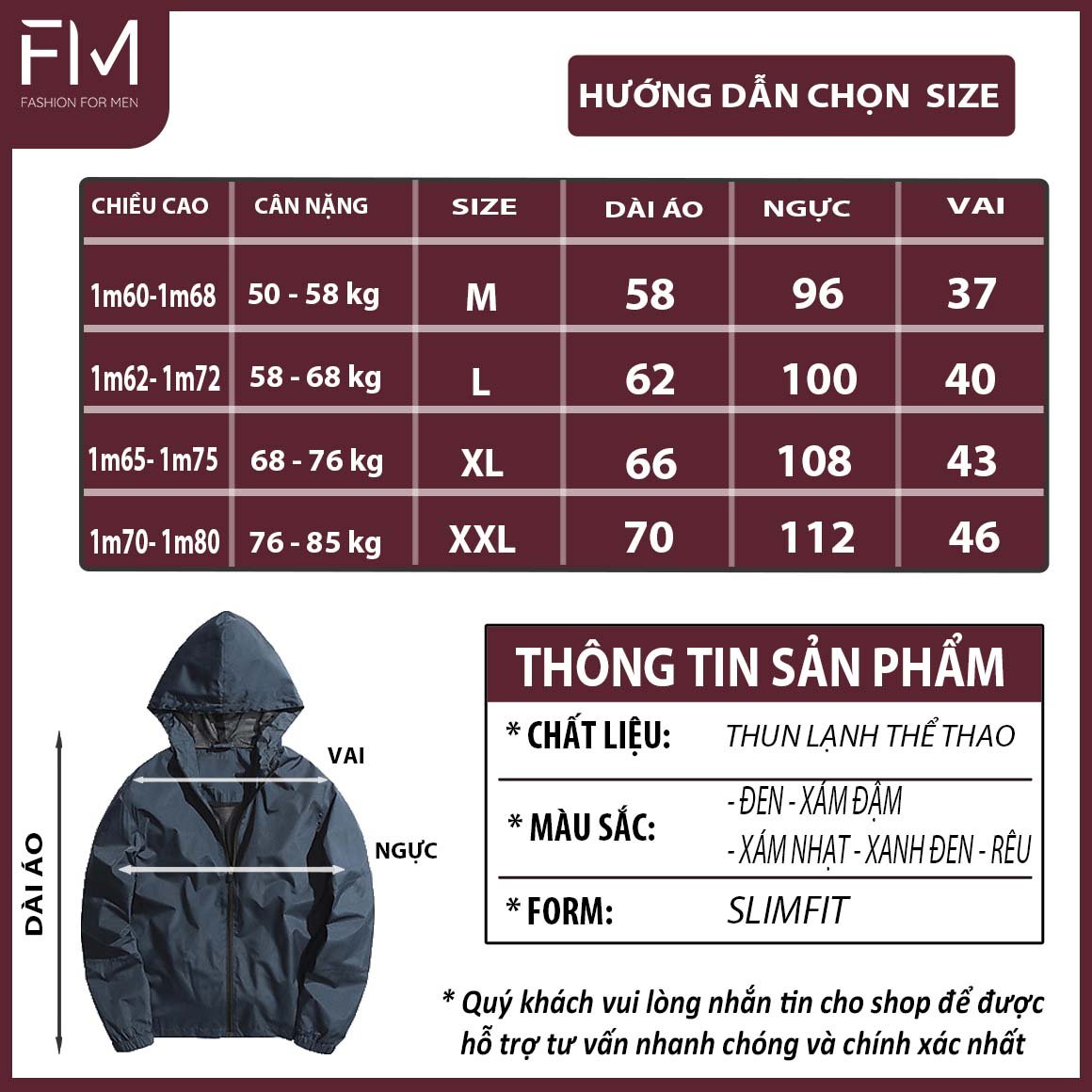 - Có 3 size: + M 50 - 60kg + L 60 - 68kg + XL 68 - 76kg Bảng màu 4 màu nam tính: Đen - Xanh đen - Xám nhạt - Xám đậm Hướng dẫn sử dụng và bảo quản: