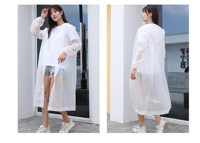 - Áo mưa thiết kế màu trắng trong suốt, có khẩu trang tiện lợi cùng tay cánh dơi rộng rãi giúp che mưa hiệu quả mà không vướng víu khi chạy xe. - Được làm