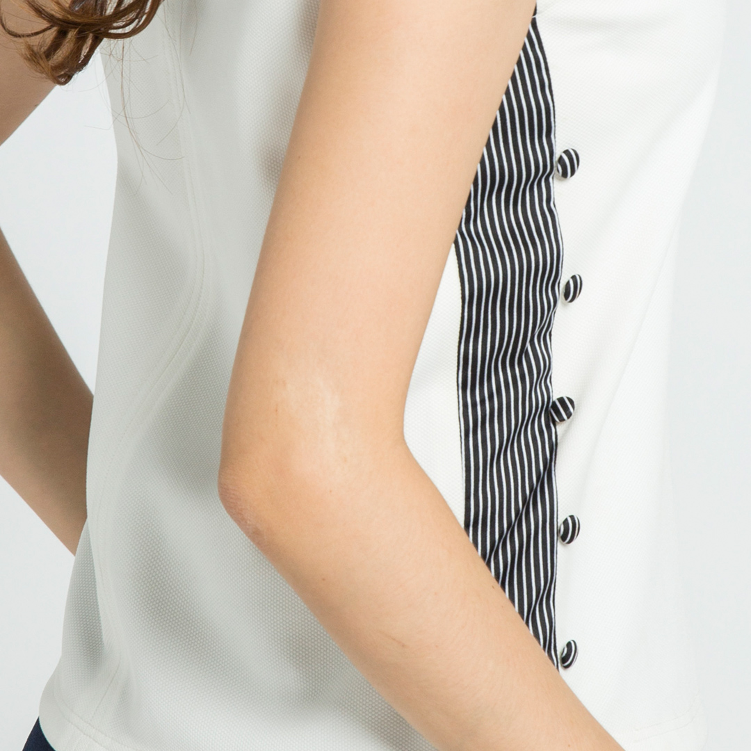 - phá cách chi tiết vải sọc và nút hai bên hông áo