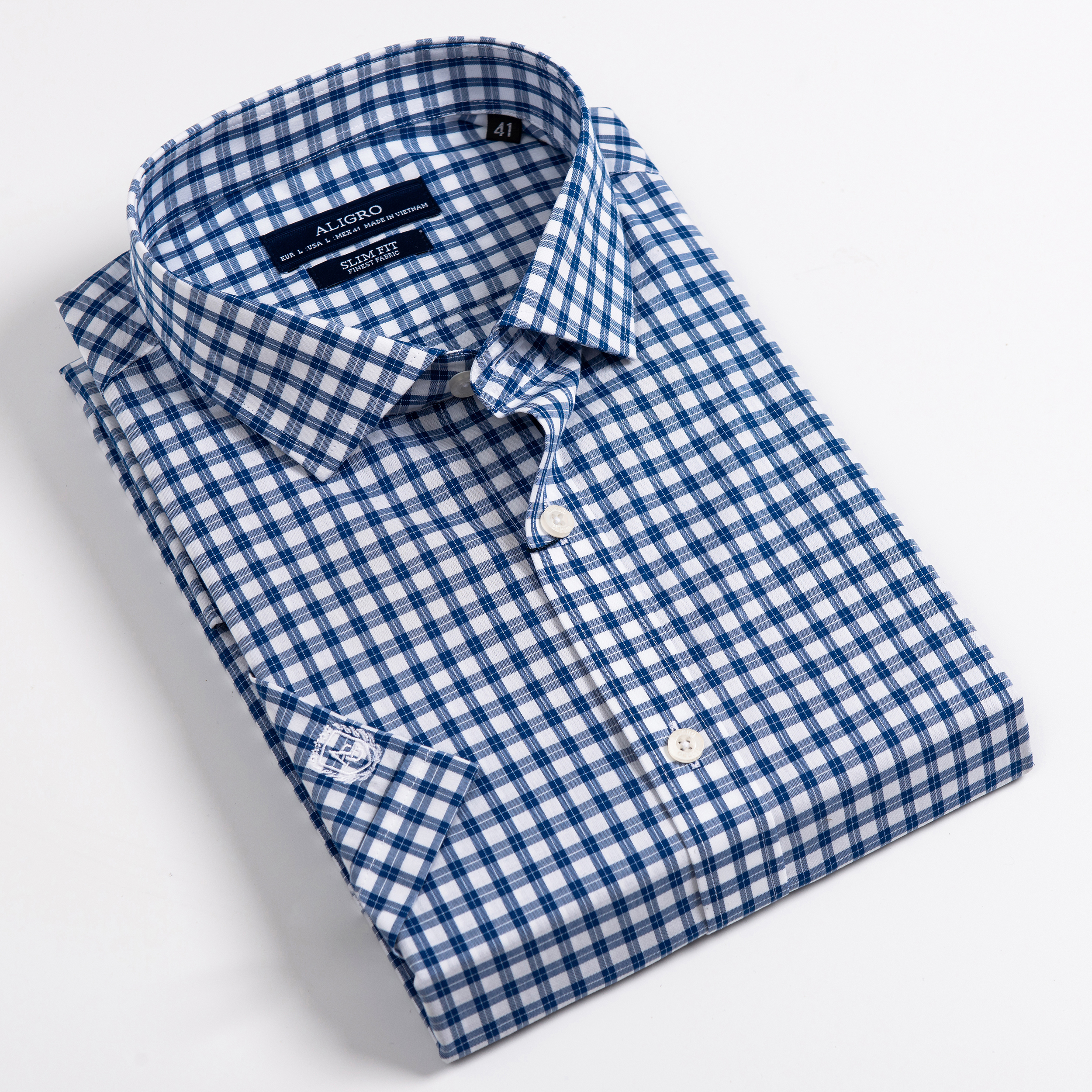 ÁO SƠ MI NAM DAI TAY KẺ CARO XANH TÍM ALIGRO ALGS186
