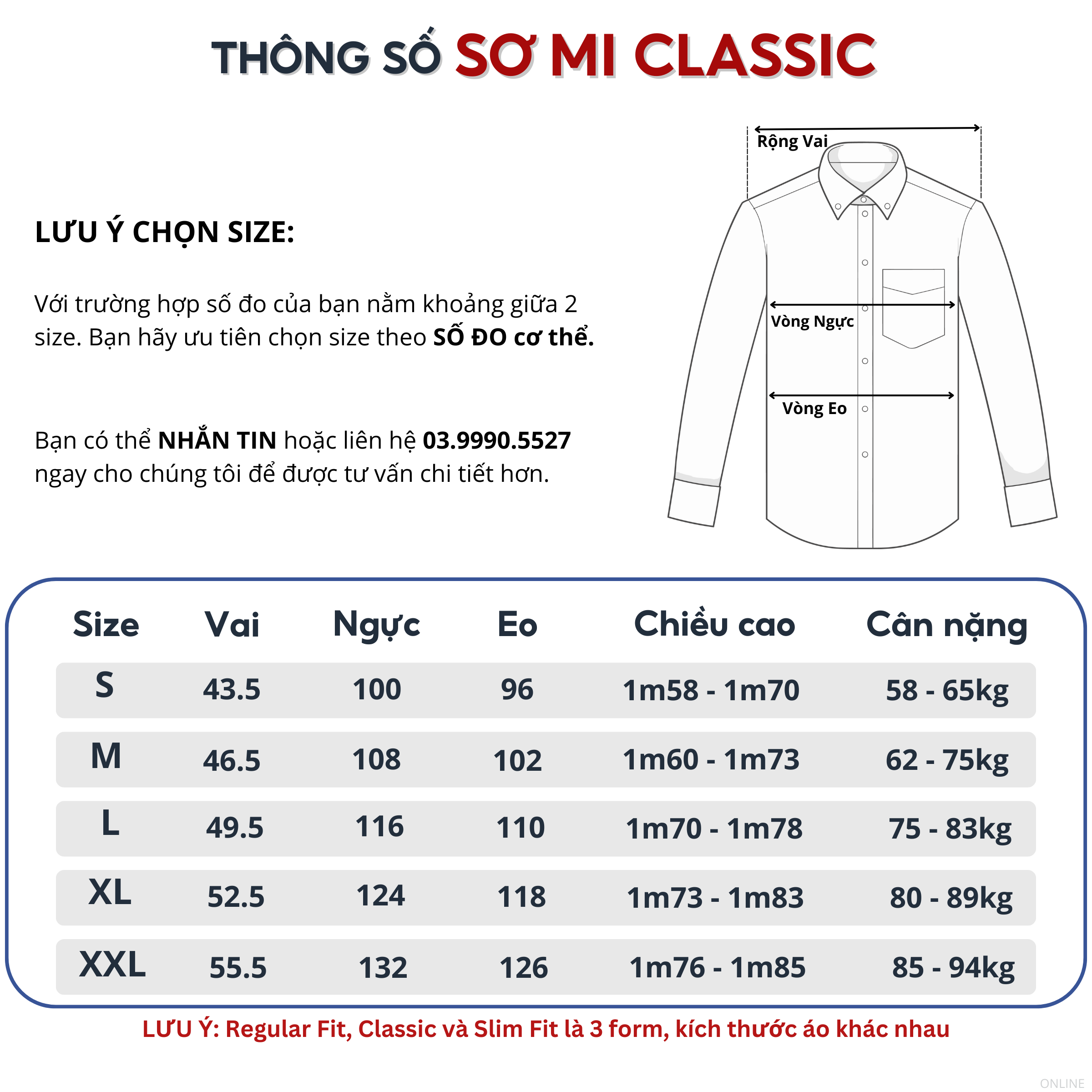 - Có 4 dáng áo CLASSIC / REGULAR / REGULAR FIT / BODY FIT với thông số khác nhau, khách hàng lưu ý kỹ thông tin, size số sản phẩm.