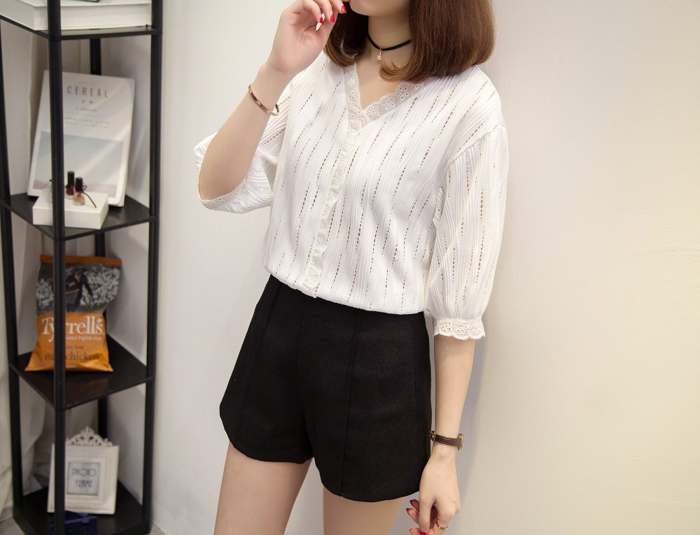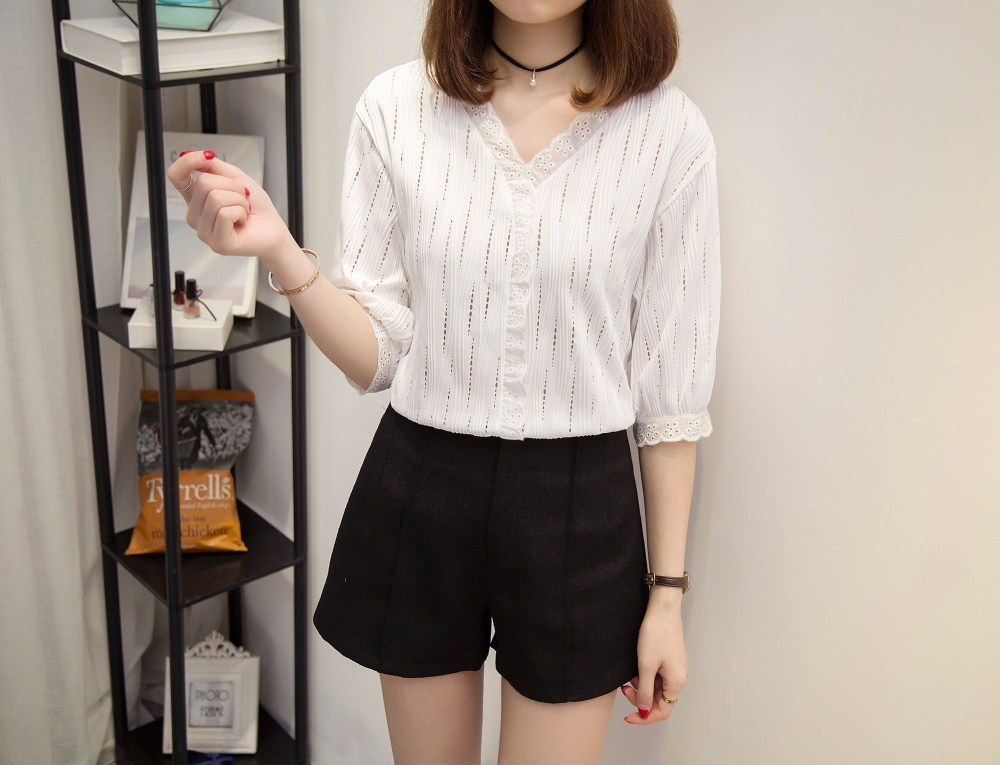 ✨Áo sơ mi nữ công sở cổ V thanh lịch, họa tiết trơn phối viền ren siêu xinh, phong cách Hàn Quốc HB185