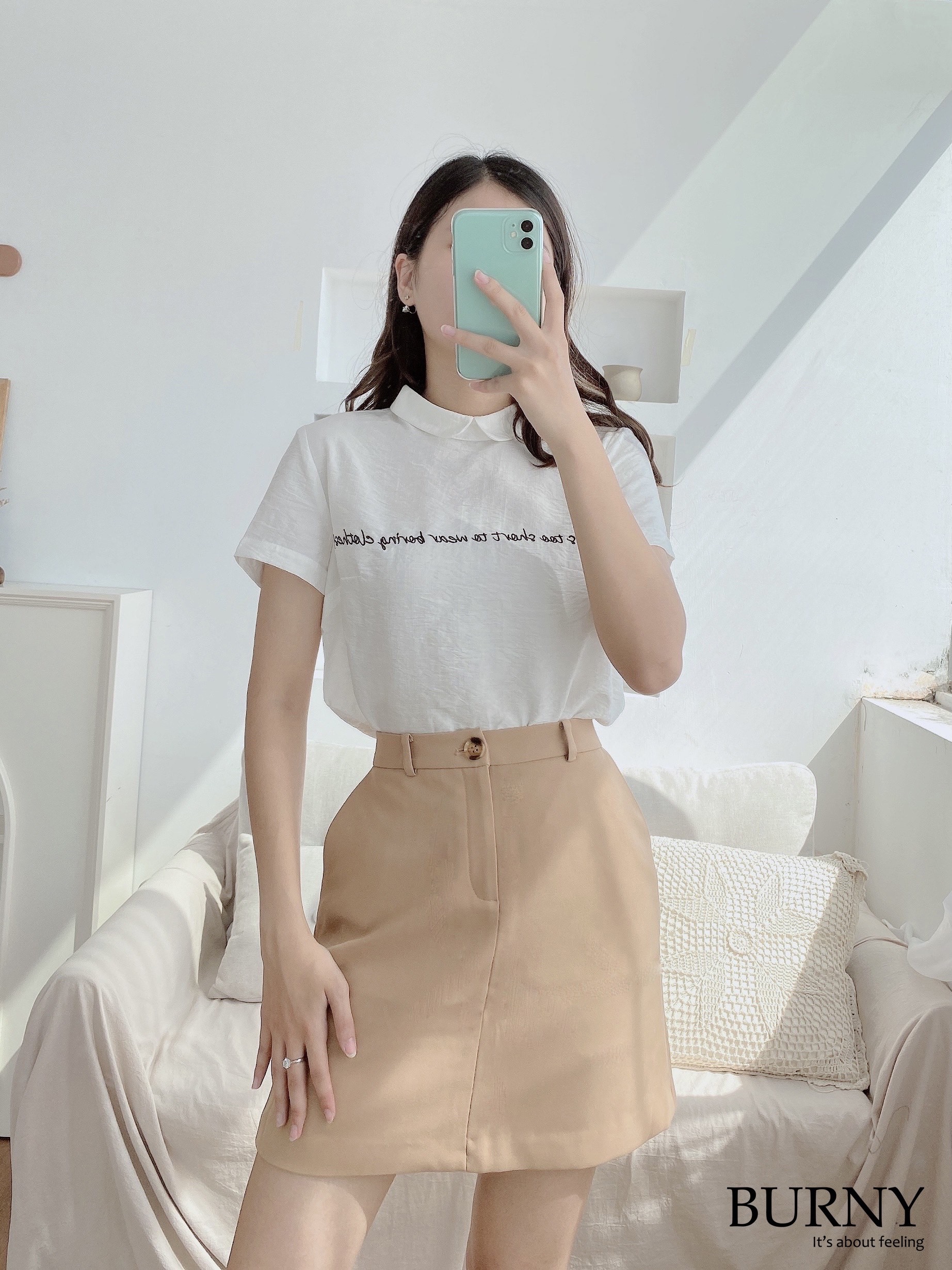 ✨Áo sơ mi nữ ngắn tay màu trắng họa tiết thêu cổ Peter Pan Burny