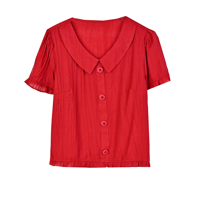 Áo sơ mi cổ sen tay ngắn xinh xắn Mô tả Size S: sản phẩm vòng eo rộng 64cm - 66cm, vòng ngực rộng 84cm-86cm, vòng mông rộng 86cm-88cm Size M: sản phẩm vòng eo