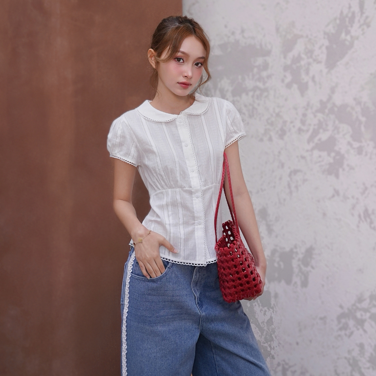 CHI TIẾT SẢN PHẨM ✿ Sản phẩm : Áo sơ mi tay ngắn viền ren dễ thương nữ tính cột nơ sau dễ phối đồ Jenni Miều Est.2013 ✿ Chất liệu : Xô Ren ✿