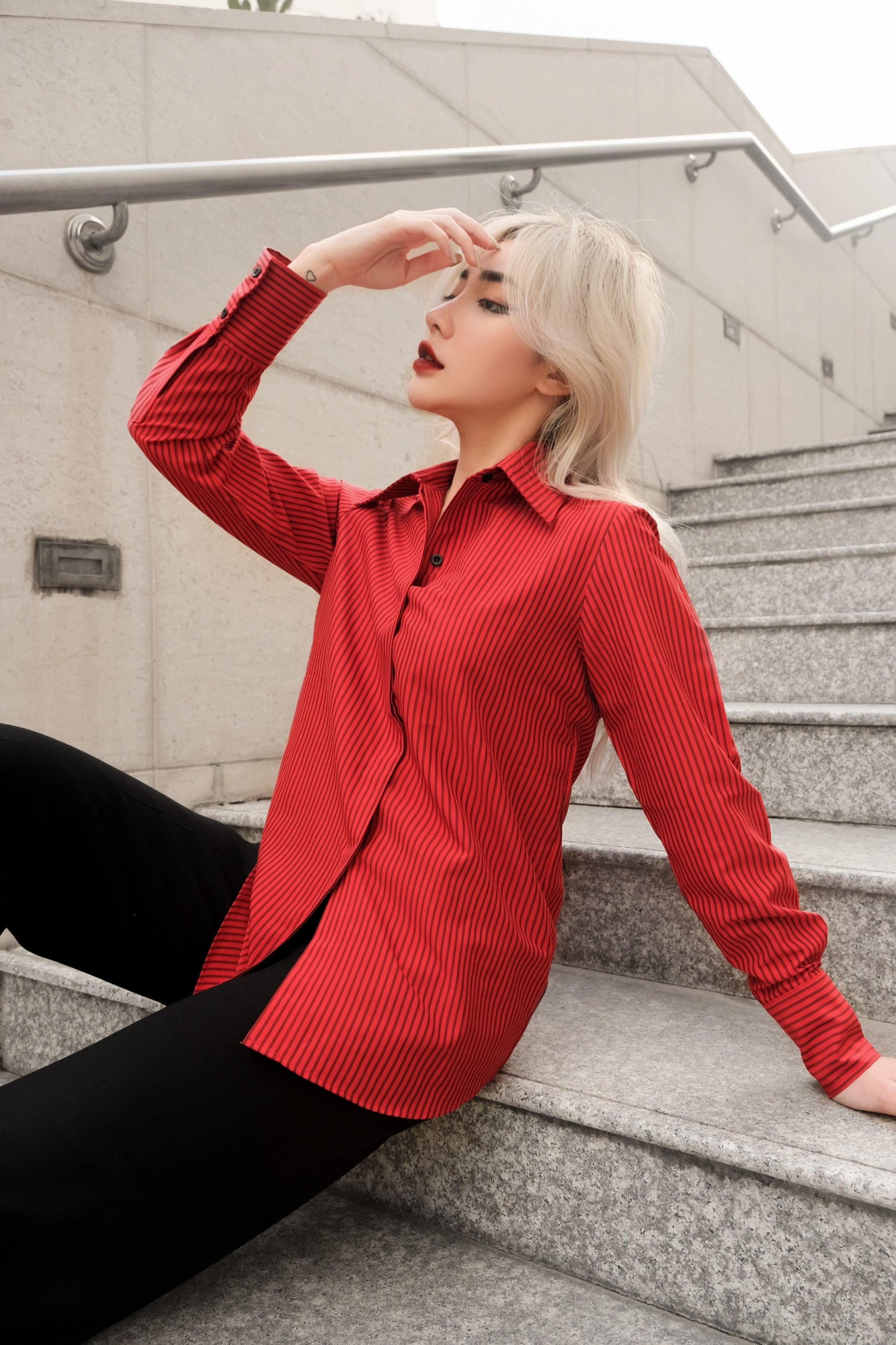 Mua tại TiktokCHẤT SOMI COTTON PHA, ĐỨNG PHOM ÁO MÀU ĐỎ SỌC ĐEN ÁO CỔ SOMI, TAY DÀI, NẸP ÁO GIẤU NÚT PHOM CĂN BẢN SUÔN ĐIỂM NHẤN TAG LOGO NGAY NẸP ÁO