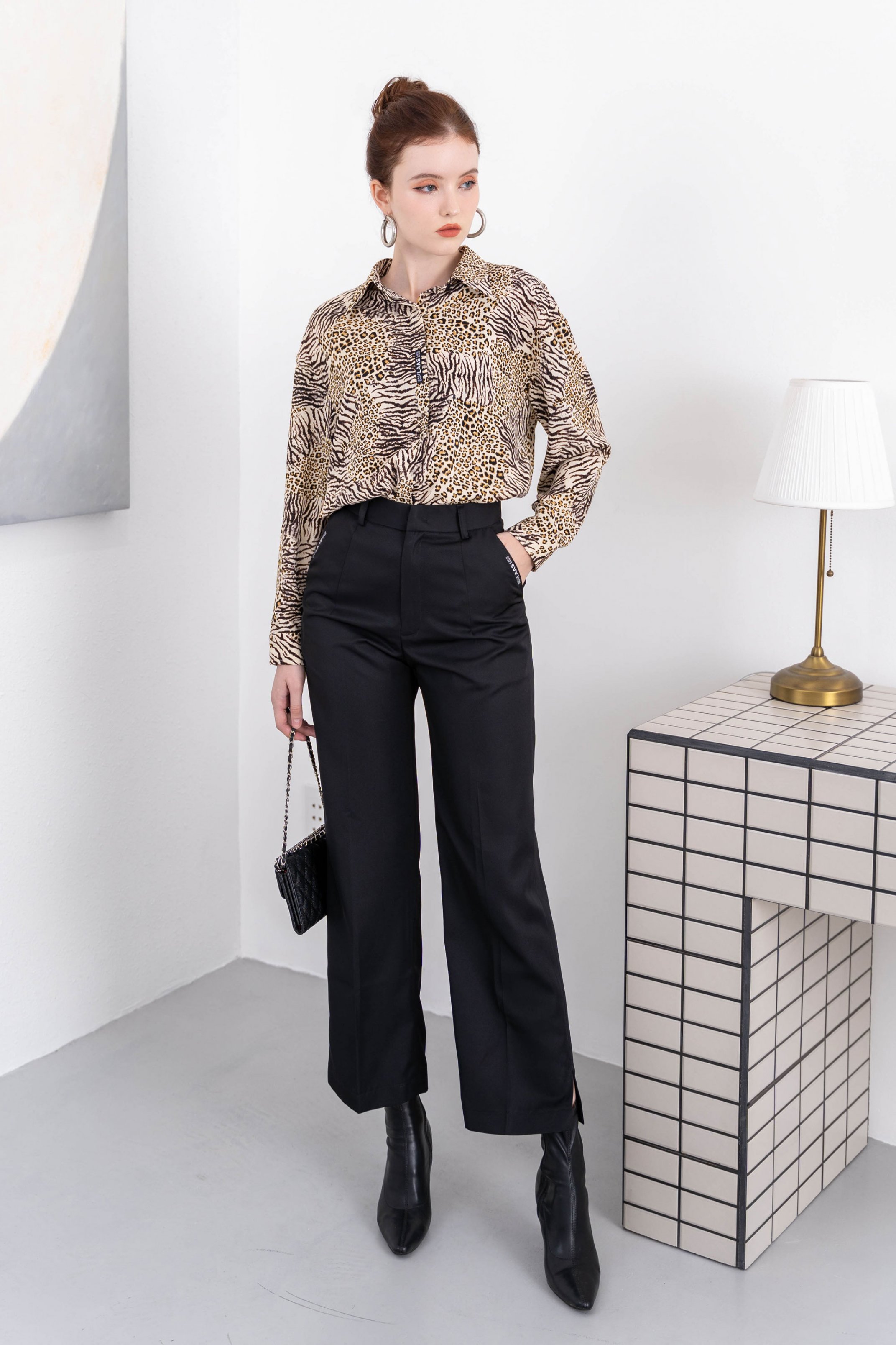 Áo sơ mi La Mộc họa tiết da beo thể hiện được nữ quyền. Thiết kế tay lỡ phồng và nhún nhẹ mang đến cảm giác thanh lịch cho nàng. Thiết kế với sự chỉnh
