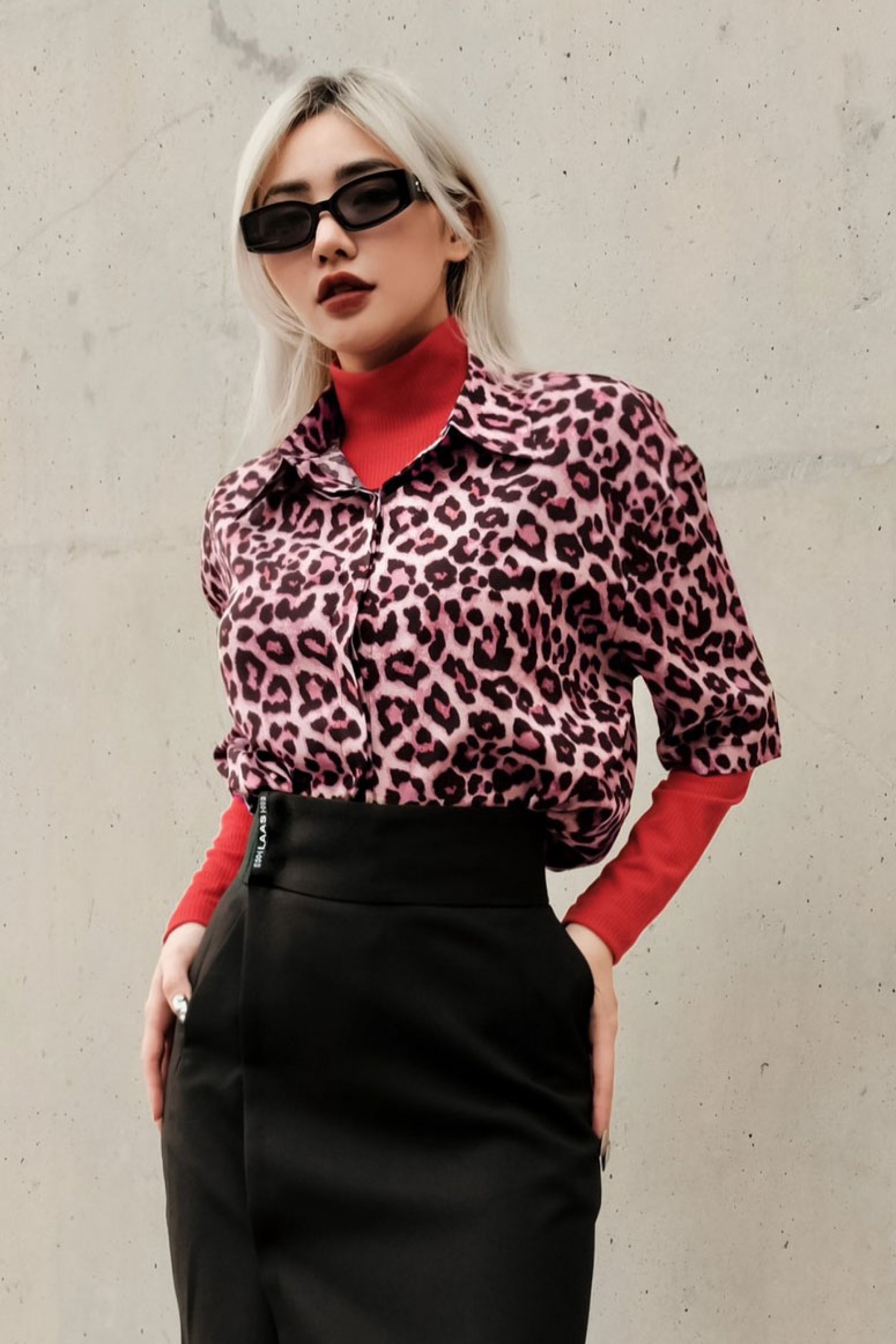 CHẤT LIỆU LỤA GIẤY, MỀM MƯỢT, KHÔNG NHĂN ÁO MÀU HỒNG, HOẠ TIẾT MÀU ĐEN ÁO SOMI NẸP GIẤU NÚT FORM RỘNG FREESIZE ĐIỂM NHẤN 1 BÊN TAY PHẢI ÁO GẮN TAG LOGO LAAS