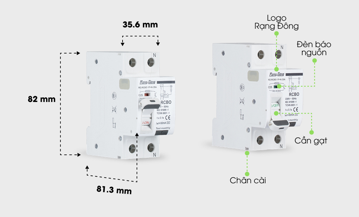 Aptomat chống giật Rạng Đông Model: RD.RCBO 1P+N 25A tích hợp 3 tính năng trong 1- Hàng Chính Hãng
