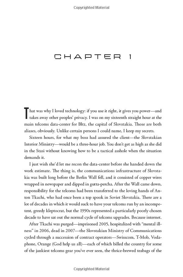 Masha works for Xoth Intelligence, an InfoSec company upgrading the Slovstakian Interior Ministry's ability to spy on its citizens' telecommunications with state-of-the-art software (at least, as state-of-the-art as Xoth is prepared to offer in its middle-upper pricing tier).