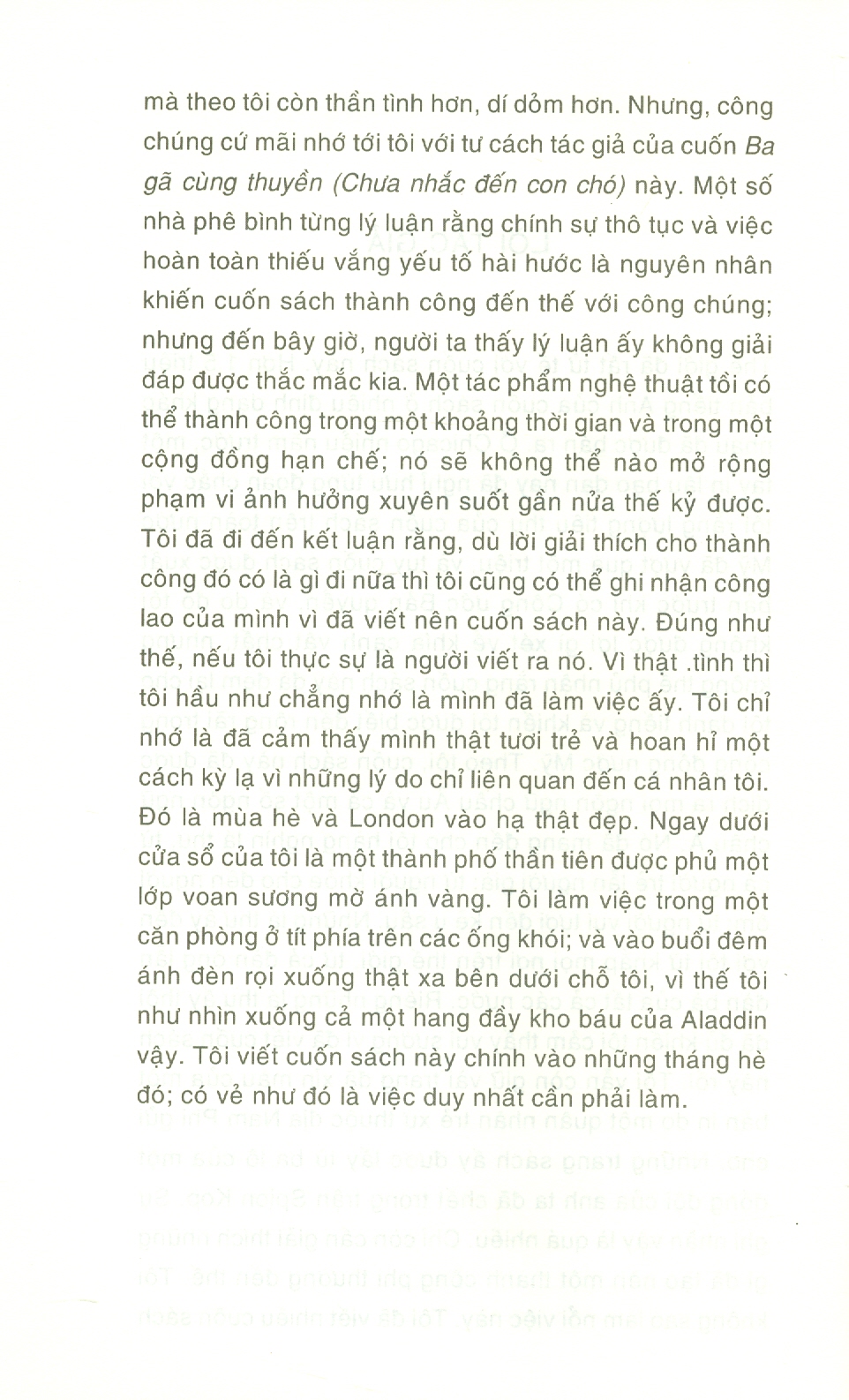 Bọn hắn có bốn mạng (tính cả con chó), và bọn hắn tiến hành chuyến du hành sông Thames để đời này với một lý do chính đáng không để đâu cho hết: để thư giãn. Quả thật, nếu không tính đến sự cứng đầu cứng cổ của mớ hành lý, sự vô ơn của con thuyền, sự quỷ quyệt của cái ấm trà, sự om sòm của bầy thiên nga ( và ) thì ái chà, bọn hắn quả đã được thư giãn thật. Thêm vào đó, bọn hắn còn được biết thế nào là một chuyến du hành đích thực…