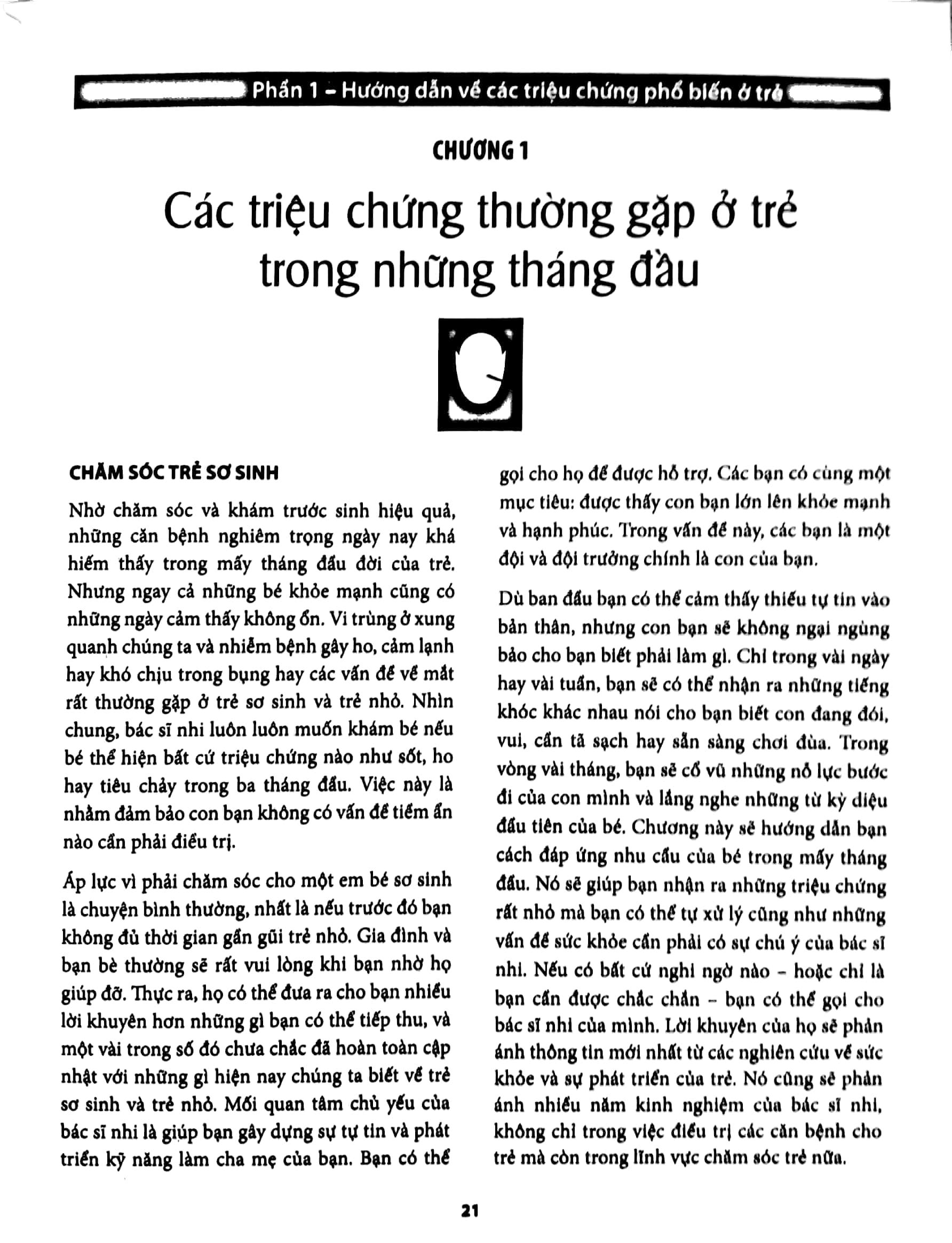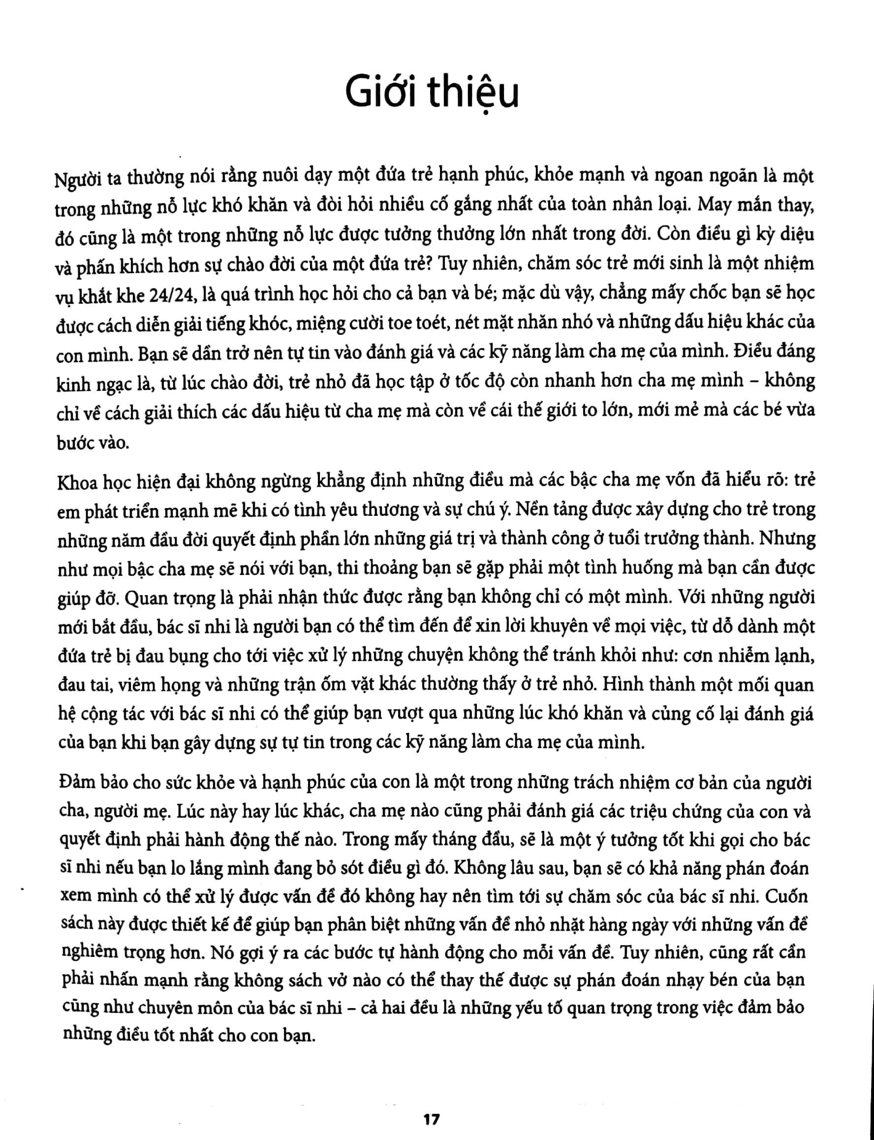 Đảm bảo cho sức khỏe và hạnh phúc của con là một trong những trách nhiệm cơ bản của người cha, người mẹ. Lúc này hay lúc khác, cha mẹ nào cũng phải đánh giá các triệu chứng của con và quyết định phải hành động thế nào. Trong mấy tháng đầu, sẽ là một ý tưởng tốt khi gọi cho bác sĩ nhi nếu bạn lo lắng m.ình đang bỏ sót điều gì đó. Không lâu sau, bạn sẽ có khả năng phán đoán xem m.ình có thể xử lý được vấn đề đó không hay nên tìm tới sự chăm sóc của bác sĩ nhi. Cuốn sách này được thiết kế để giúp bạn phân biệt những vấn đề nhỏ nhặt hàng ngày với những vấn đề nghiêm trọng hơn. Nó gợi ý ra các bước tự hành động cho mỗi vấn đề. Tuy nhiên, cũng rất cần phải nhấn mạnh rằng không sách vở nào có thể thay thế được sự phán đoán nhạy bén của bạn
