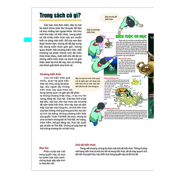 - Những chương kiến thức của quyển “Vườn Trái Đất” đã chọn, chúng tôi chia ra thành những bài về Trái Đất, khí tượng, thám hiểm, thế giới động vật, thực vật, quốc gia và bảo vệ Trái Đất. Chúng sẽ giúp bạn lật mở những chương lớn về kiến thức. Trong mỗi chương, chúng tôi chọn một chủ đề kiến thức. Thông thường mỗi trang triển khai là một chủ đề nội dung kiến thức, tất cả xoay quanh chủ đề triển khai giới thiệu này. Kiến thức trong quyển này có 92 chủ đề.