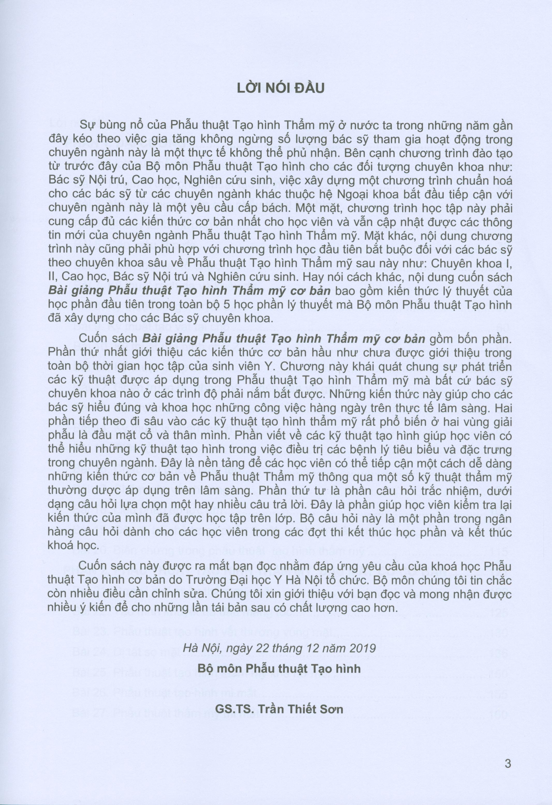 Cuốn sách "Bài giảng Phẫu thuật Tạo hình Thẩm mỹ cơ bản" gồm bốn phần. Phần thứ nhất giới thiệu các kiến thức cơ bản hầu như chưa được giới thiệu trong toàn bộ thời