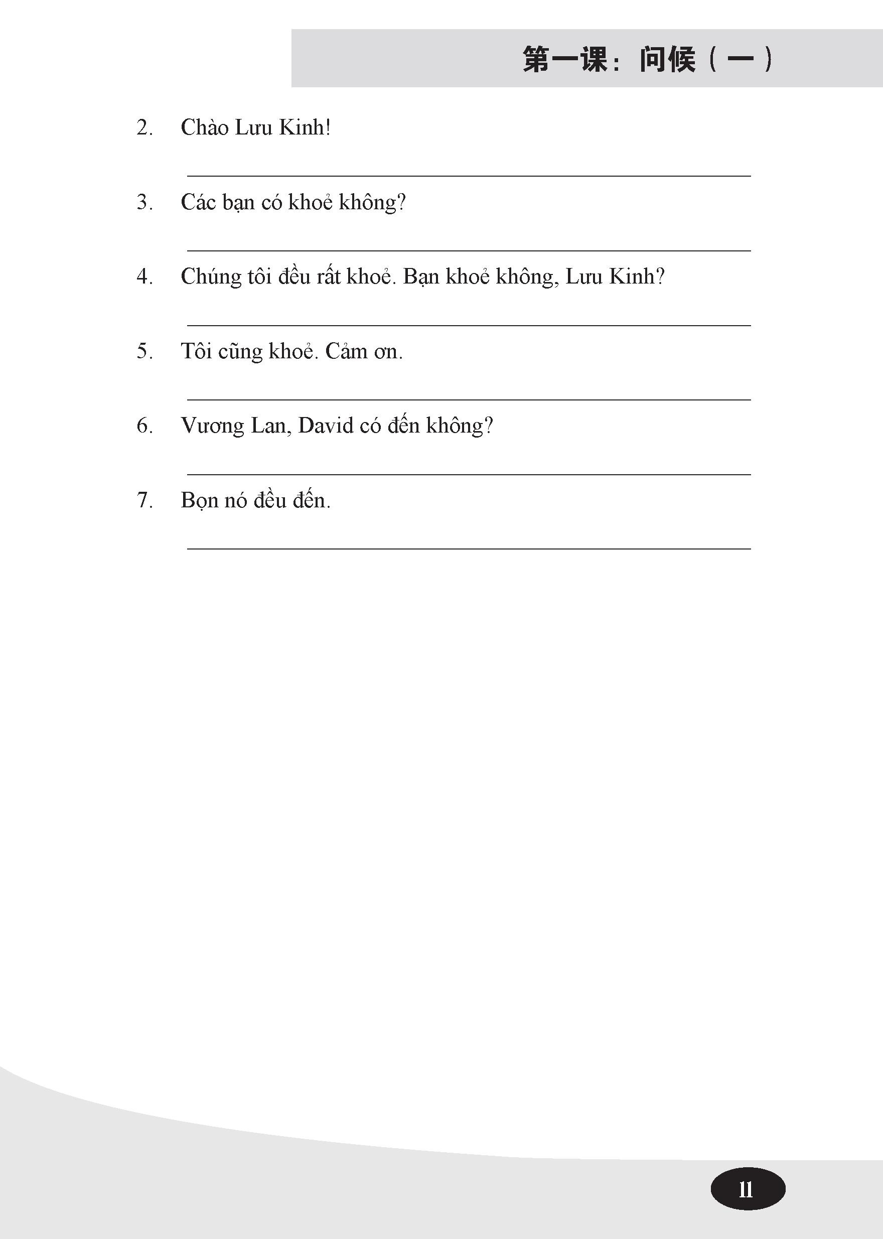 1 你好!Nǐ hǎo! Chào bạn! 2 你好吗?Nǐ hǎo ma? Bạn khỏe không? 3 你爸爸妈妈身体好吗?Nǐ bàba māma shēntǐ hǎo ma? Sức khỏe bố mẹ bạn tốt không? 4 我爸爸妈妈身体都很好。Wǒ bàba māma shēntǐ dōu hěn hǎo. Sức