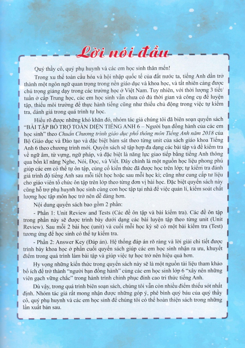 Bài Tập Bổ Trợ Toàn Diện Tiếng Anh 6 “BÀI TẬP BỔ TRỢ TOÀN DIỆN TIẾNG ANH 6 - Người bạn đồng hành của các em học sinh” theo Chuẩn Chương trình giáo dục phổ thông môn Tiếng Anh năm 2018 của Bộ Giáo dục và Đào tạo và đặc biệt bám sát theo từng unit của sách giáo khoa Tiếng Anh 6 theo chương trình mới. Quyển sách sẽ tập hợp đa dạng các bài tập và đề kiểm tra về ngữ âm, từ vựng, ngữ pháp, và đặc biệt là năng lực giao tiếp bằng tiếng Anh. Phần 1 Các đề ôn tập và bài kiểm tra Phần 2 là đáp án Thông qua bốn kĩ năng Nghe, Nói, Đọc, Viết. Đây chính là một nguồn học liệu phong phú giúp các em có thể tự ôn tập, củng cố kiến thức đã được học trên lớp; tự kiểm tra đánh giá trình độ tiếng Anh sau mỗi tiết học hoặc sau mỗi học kì; cũng như cung cấp tư liệu cho giáo viên tổ chức ôn tập trên lớp theo từng đơn vị bài học.
