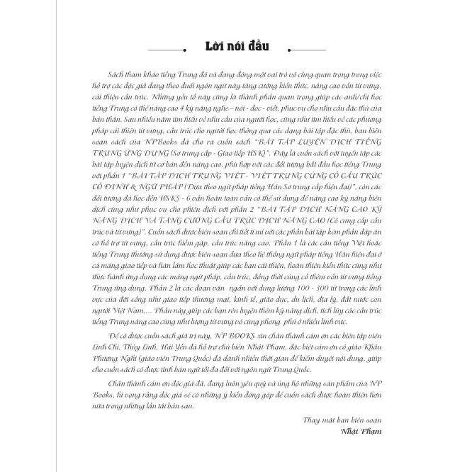 2. Bài tập luyện dịch tiếng Trung ứng dụng (Sơ -Trung cấp, Giao tiếp HSK) Tác giả: Nhật Phạm Ngày xuất bản: 12-03-2021 Loại bìa Bìa mềm Số trang 335 Nhà xuất bản Nhà Xuất