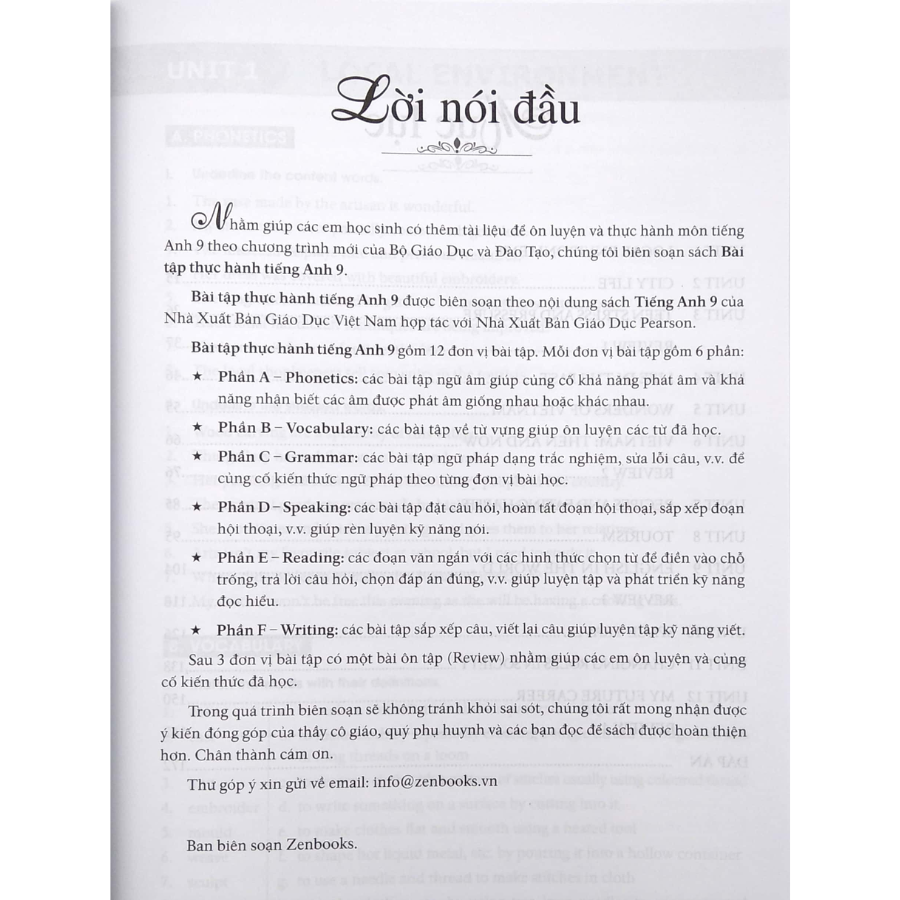 Bài tập thực hành tiếng Anh 9 gồm 12 đơn vị bài tập. Mỗi đơn vị bài tập gồm 6 phần: