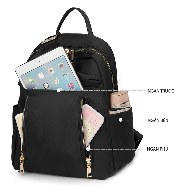 Kích thước túi: Trung bình Công suất: 20-35L Cấu trúc bên trong túi: Túi điện thoại di động, Túi tài liệu Mở nắp: dây kéo Chất liệu: Nylon Đã khóa hay không: Không Che mưa