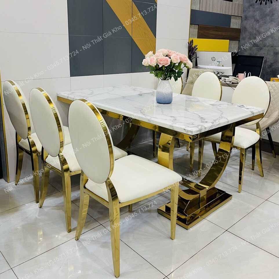 Bàn ăn mặt đá cẩm thạch nhân tạo cao cấp chống trầy xước ố vàng kết hợp ghế Louis khung inox mạ vàngBàn ăn mặt đá cẩm thạch nhân tạo cao cấp chống trầy xước ố vàng kết hợp ghế Louis khung inox mạ vàngBàn ăn mặt đá cẩm thạch nhân tạo cao cấp chống trầy xước ố vàng kết hợp ghế Louis khung inox mạ vàng