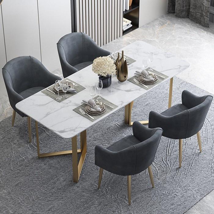 Bàn ăn vân đá cẩm thạch màu trắng - Bàn ăn chân chữ V kim loại mạ nhũ vàng đồng