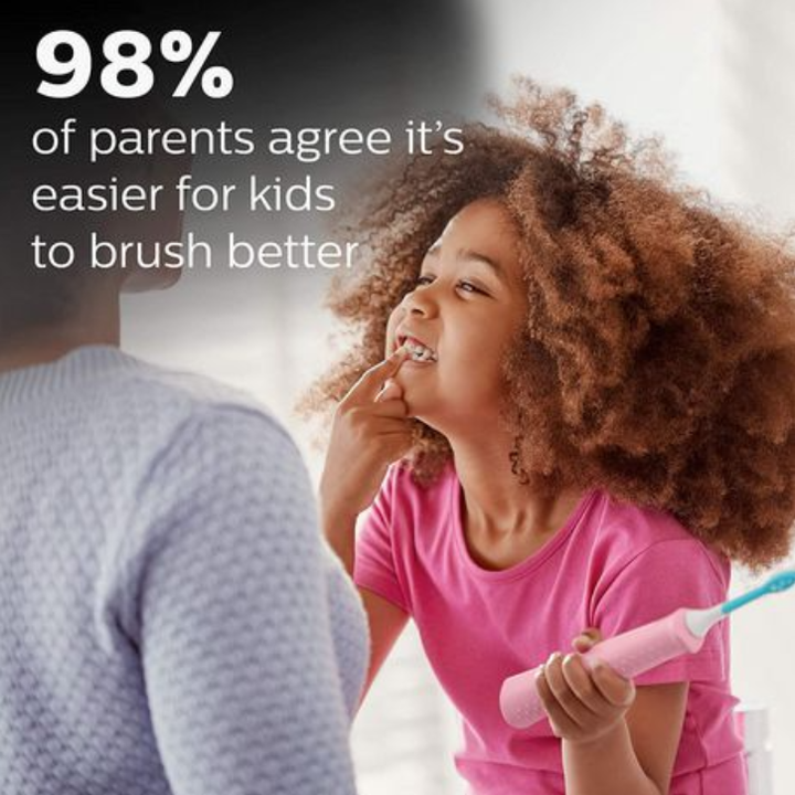 - Hoạt động năng động độc đáo của bàn chải đánh răng điện Philips Sonicare HX6352/43 – Kid tiếp cận sâu giữa các kẽ răng và đường viền nướu một cách nhẹ nhàng và hiệu quả. Với hơn 500 lần vuốt mỗi giây, công suất làm sạch bằng âm giúp bù đắp cho răng đang phát triển khi trẻ phát triển tốt hơn trong việc đánh răng. Công nghệ này giúp bàn chải đánh răng Philips Sonicare HX6352/43 – Kid hiệu quả hơn đến 75% so với bàn chải đánh răng thủ công, giúp kiểm tra thành công hơn. Thiết kế tay cầm tiện ích cho phụ huynh và bé