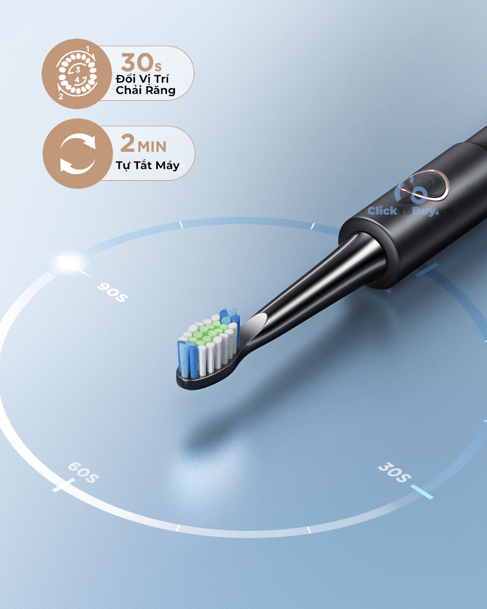 - Tính năng tự tắt sau 2 phút, và rung nhẹ mỗi 30 giây để nhắc đổi bề mặt răng ( mặt trong mặt ngoài của răng)