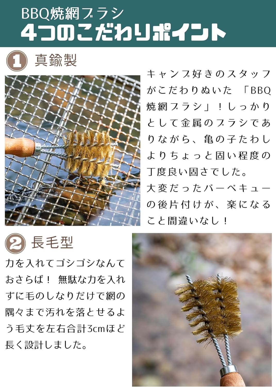 ① Lông bàn chải bằng đồng thau mật độ cao cho phép bạn loại bỏ bụi bẩn ở mọi ngóc ngách của vỉ lưới chỉ bằng cách uốn cong lông bàn chải mà không cần dùng lực không cần thiết.