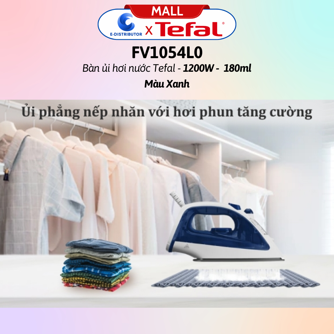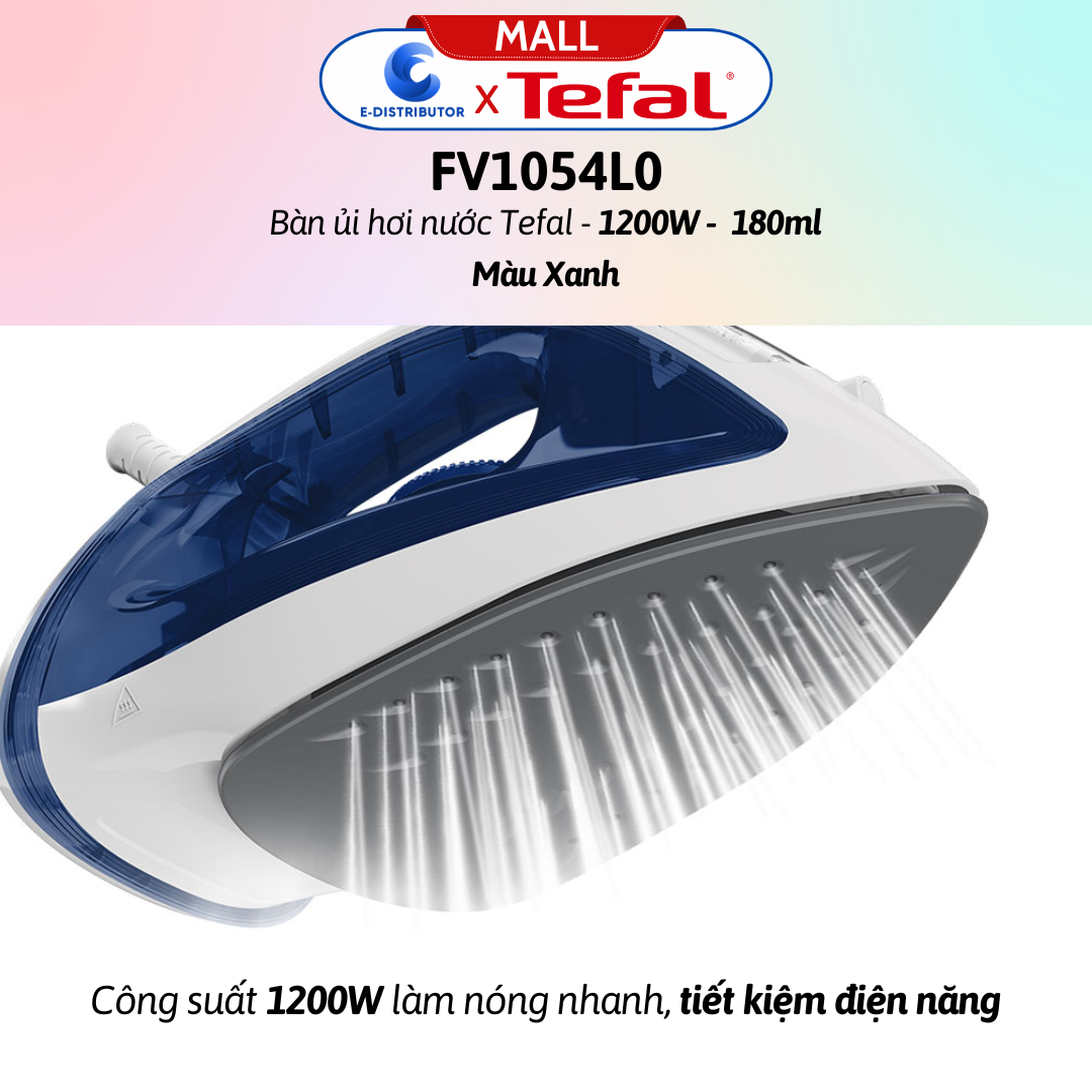 THÔNG TIN SẢN PHẨM Bàn ủi hơi nước Tefal FV1054L0 1200W (Màu Xanh) Đặc điểm nổi bật - Thiết kế nhỏ gọn, dễ di chuyển, hạn chế mỏi tay - Công suất 1200W làm nóng nhanh, tiết kiệm điện năng - Dung tích bình nước 180 ml ủi được nhiều quần áo cùng lúc - Hơi phun tăng cường 80g ủi các vết nhăn khó nhằn - Mặt đế Ceramic chống dính di chuyển mượt mà trên mặt vải Thông số kỹ thuật Bàn ủi hơi nước Tefal FV1054L0 Loại bàn ủi: Bàn ủi hơi nước Chiều dài dây dẫn: 1.8 mét Chất liệu đế : Ceramic Công suất : 1200W Dung tích bình nước: 180 ml Thiết kế nhỏ gọn, màu sắc bắt mắt Bàn ủi hơi nước Tefal FV1054L0 có thiết kế nhỏ gọn, chất liệu bền tốt. Dây điện dài 1.8m tiện di chuyển trong quá trình ủi. Công suất hoạt động 1200W giúp tiết kiệm điện năng hiệu quả. Mặt đế Ceramic chống dính lướt êm ái trên mặt vải Bàn ủi Tefal FV1054L0 có mặt đế Ceramic chống dính, hạn chế trầy xước, lướt êm ái trên mặt vải để ủi quần áo nhanh hơn. Dung tích bình chứa nước 180 ml Bàn ủi hơi nước Tefal FV1054L0 có dung tích chứa nước là 180 ml để bạn ủi được nhiều quần áo hơn khoảng 2 - 3 bộ quần áo (tùy vào độ nhăn và chất liệu vải) cùng với chế độ phun hơi và phun tia nước giúp làm phẳng các vết nhăn cứng đầu hiệu quả.Lưu ý: chỉ nên dùng nước sạch không đổ thêm tinh dầu hay nước hoa vào để hạn chế đóng cặn và gây hư hỏng cho bàn ủi. Phun tăng cường giúp ủi phẳng nếp nhăn cứng đầu Hơi phun tăng cường 80g ủi các vết nhăn khó nhằn giúp bạn tiết kiệm thời gian ủi đồ và rãnh tay làm các công việc khác. Ngoài ra, bạn cũng có thể tùy chỉnh mức phun hơi phù hợp theo nhu cầu sử dụng với từng loại quần áo khác nhau.THÔNG TIN SẢN PHẨM Thông số kỹ thuật Bàn ủi hơi nước Tefal Easy Steam FV1955E0 1400W - Công suất 1400W - Bình nước 220 ml - Mặt đế Ceramic chống dính -