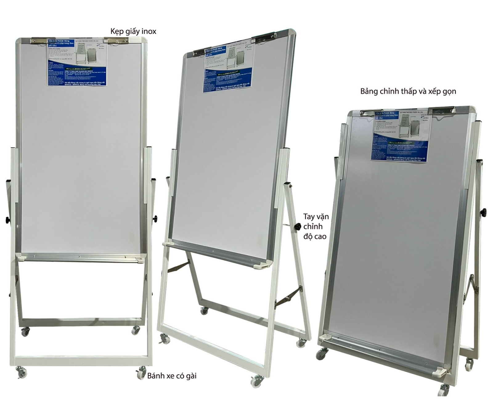 Bảng kích thước 80x120cm , mặt bảng kẹp được giấy A0, viết dễ xóa BẢNG: - Mặt bảng: màu trắng viết bút lông Poly Taiwan: không lem & không dính mực sau khi xóa, không kẻ