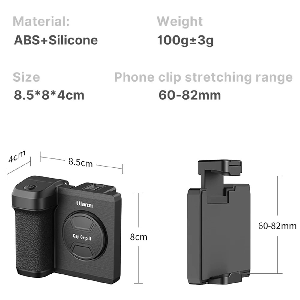 THÔNG SỐ KĨ THUẬT: Thương hiệu: Ulanzi Model: Capgrip II (CG01) Chất liệu: ○ Capgrip: ABS + PC ○ Capgrip II: ABS + Silicone Khoảng cách kẹp: ○ Capgrip: 62-83mm ○ Capgrip II: 60-82mm