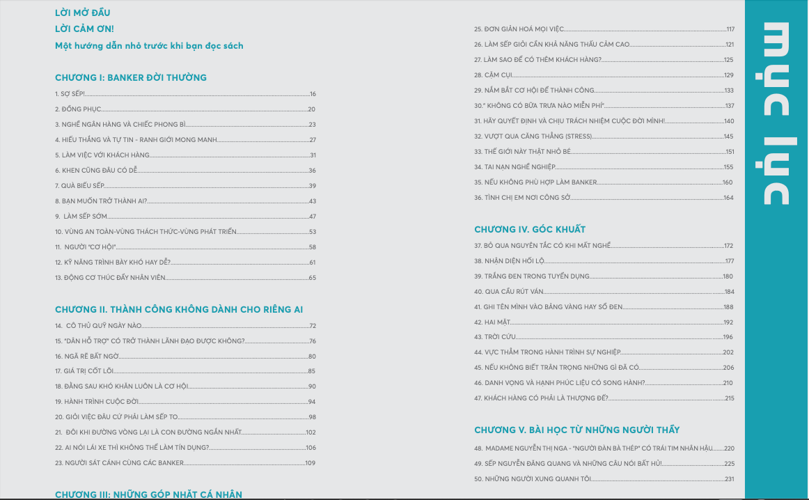 Cuốn sách viết về những câu chuyện của bản thân trong hành trình làm Banker từ vị trí quản lý thấp nhất đến trở thành Phó tổng giám đốc ngân hàng, những quan sát, những đúc kết, trải nghiệm của tôi trong suốt hơn 20 năm làm nghề. Những câu chuyện của nhân viên, đồng nghiệp bên tôi ngần ấy năm, những bài học đắt giá để học hỏi và trưởng thành được ghi lại, phân tích trên góc nhìn của một người đã trải qua nhiều vị trí và thấu cảm với mọi người; mỗi Banker sẽ thấy mình đâu đó trong từng câu chuyện.