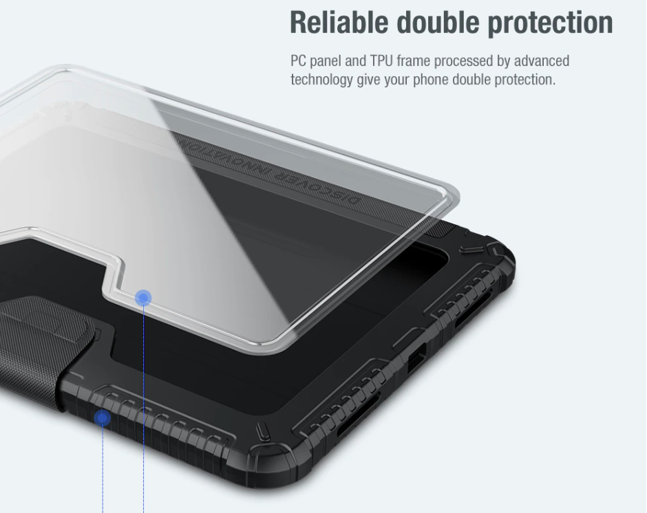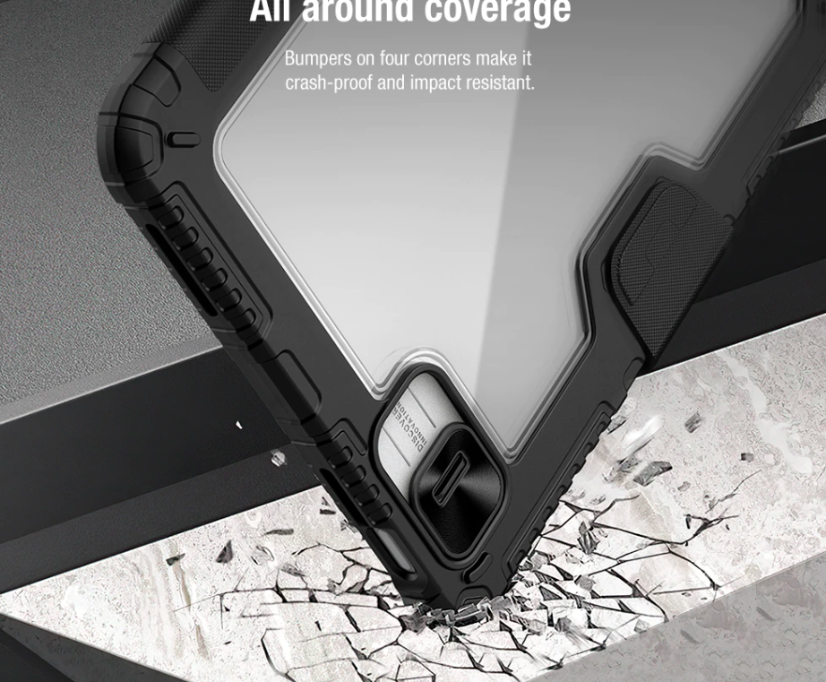 Mặt lưng sau Bao da iPad Gen 10 chống sốc hiệu Nillkin Bumber Pro có ngăn đựng bút được phủ một mặt PC trong suốt kết hợp với các cạnh viền TPU chống sốc. Sự kết hợp này mang lại sự yên tâm cho người dùng, chống chịu mọi va đập cực tốt.