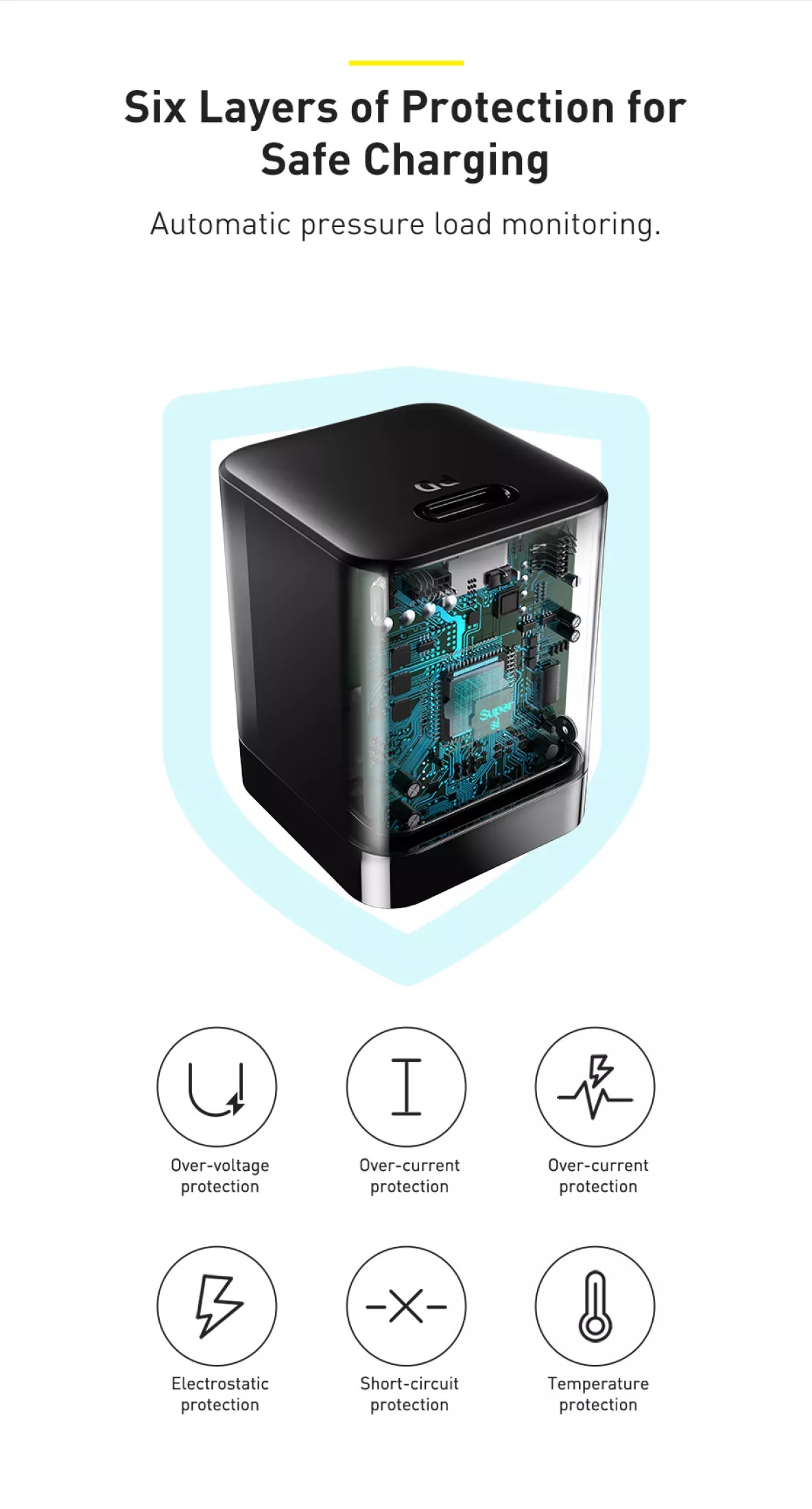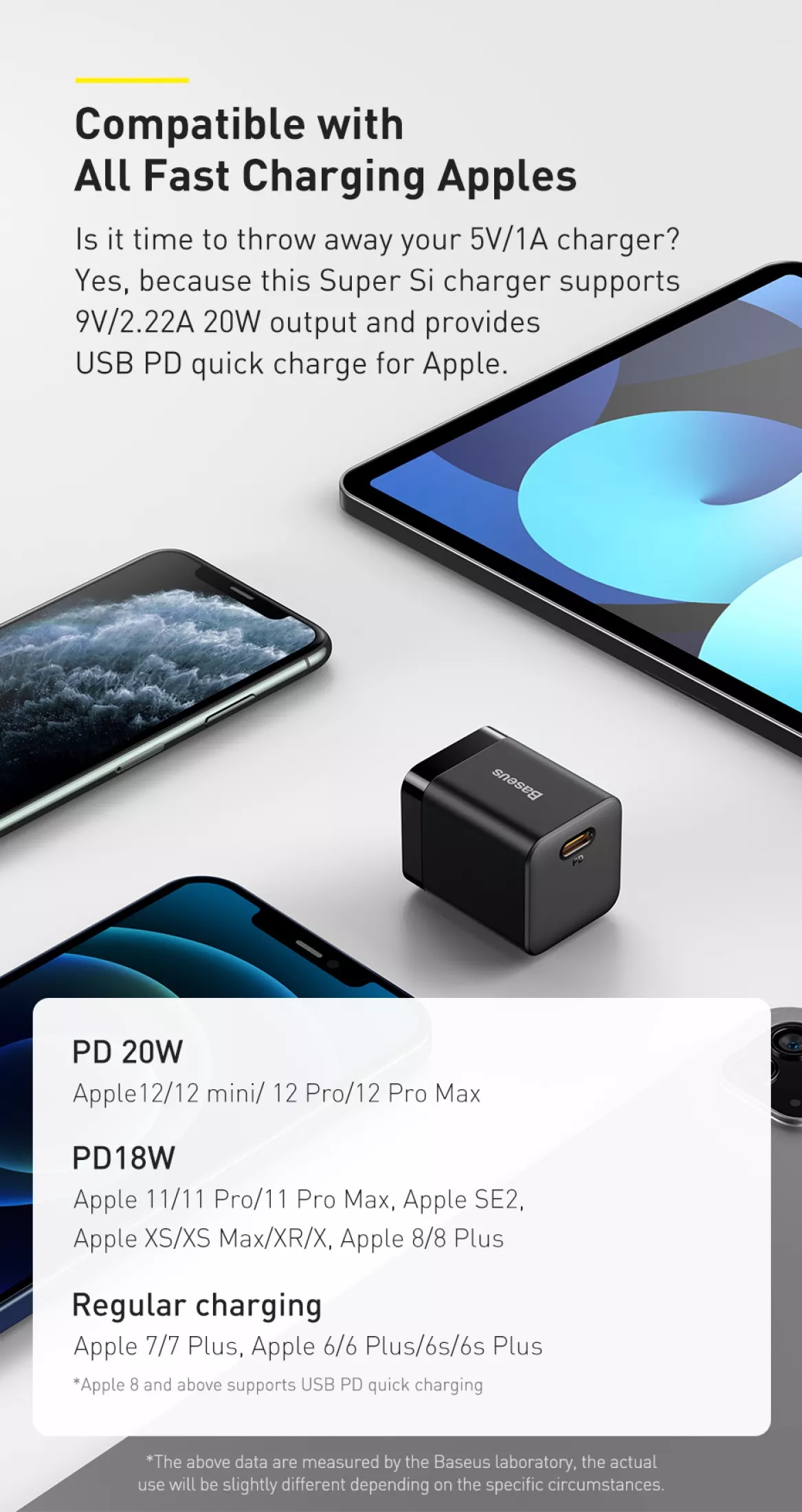 1. Input: 100-240V~50/60Hz 700mA Max 2. Output: 5V/3A 9V/2.77A 12V/2.08A 3. PPS: 3.3~11V/2.25A 4. Total Output Power: 25W Max 5. Compatible with: 6. PD3.0 (PD2.0) 7. QC4.0+ (QC4.0/QC3.0/QC2.0) 8. FCP/AFC/PPS 9. BC1.2--5V1.5A 10. UL, PSE,