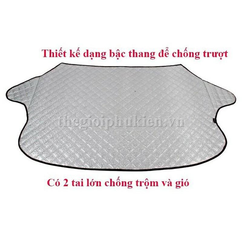 Bạt che nắng kính lái Ô tô, Xe hơi – Phủ bên ngoài Được thiết kế gồm 3 lớp với chất liệu dày dặn chắc chắn, có lớp tráng nhôm, chống ánh nắng mặt trời, chống bức xạ nhiệt khi bị chiếu nắng trực tiếp, làm giảm nhiệt độ trong xe, tránh các tác hại gây ra cho ô tô do nhiệt độ quá cao. Tấm chắn nắng ô tô gần như ôm khít phần kính chắn gió của xe, tai ngoe có thể kẹp vào hai bên cửa xe ô tô chắc chắn, chống bay khi trời nổi gió. Có thể xếp gọn để cất giữ trong ô tô, tiện lợi, không chiếm diện tích. Phù hợp với tất cả các dòng xe SUV, sedan, hatchback.