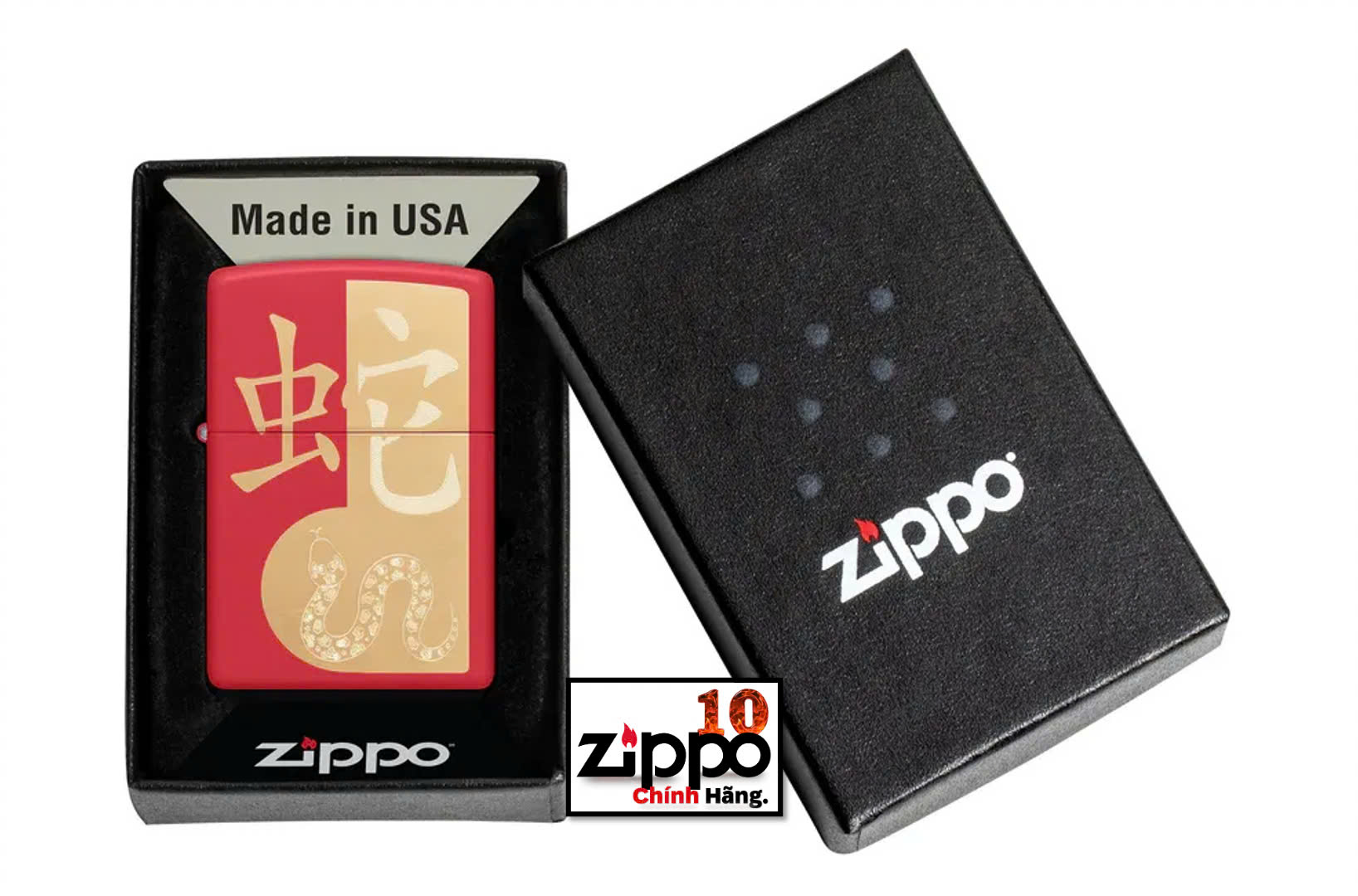 Đón chào năm con Rắn vào năm 2025 với chiếc bật lửa Red Matte tuyệt đẹp này. Tượng trưng cho sự khôn ngoan, quyết tâm và bí ẩn, con rắn cuộn tròn bên dưới ký tự Châu Á truyền thống của nó với tông màu đồng thau sang trọng với quy trình kết hợp Laser/Khắc tự động của Zippo. Được đóng gói trong một hộp đựng dạng quà tặng. Để tối ưu hiệu suất, hãy dùng nhiên liệu bật lửa của Zippo.