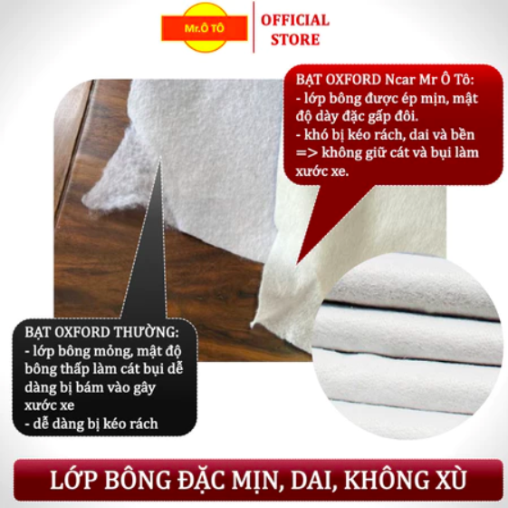 - CHỐNG NÓNG tuyệt vời cho ô tô khi đỗ ngoài trời nắng. Lớp bên trong LÓT BÔNG mềm mại KHÔNG làm TRẦY XƯỚC khi chà xát với sơn xe. Bạt phủ dù Oxford được sản xuất bằng vật liệu vải dù Oxford, mặt ngoài được bọc tráng nhôm nên rất bền với thời gian