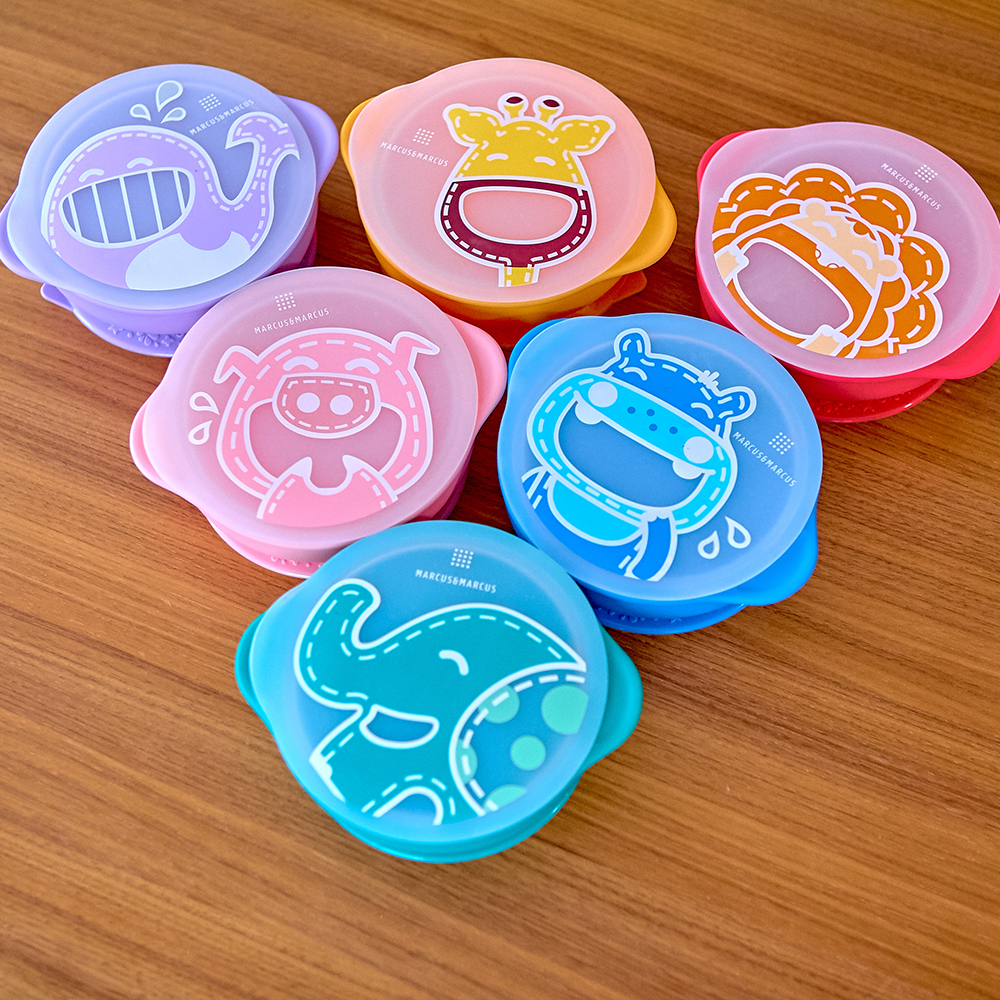 Hãy chọn cho bé một chiếc bát tập ăn silicon với màu sắc bắt mắt theo chủ đề con vật đáng yêu trong gia đình Marcus & Marcus: sư tử Marcus (Đỏ), heo con Pokey (Hồng), hươu cao cổ Lola (Vàng), voi con Ollie (Xanh lá), cá voi Willo (Tím) và hà mã Lucas (Xanh dương).