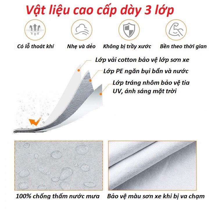Sự cải tiến vượt trội ở dòng bạt phủ mới nhất này: Bạt che xe được may từ chất liệu vải dù bền đẹp và rất chắc chắn. Vải Bạt phủ xe được làm bằng vải dù cao cấp. Sản phẩm được tráng một lớp keo chống thấm nước , chống nắng xiên ngoài ra còn được phủ một lớp PU Nhôm bên trong chống tia hồng ngoại .