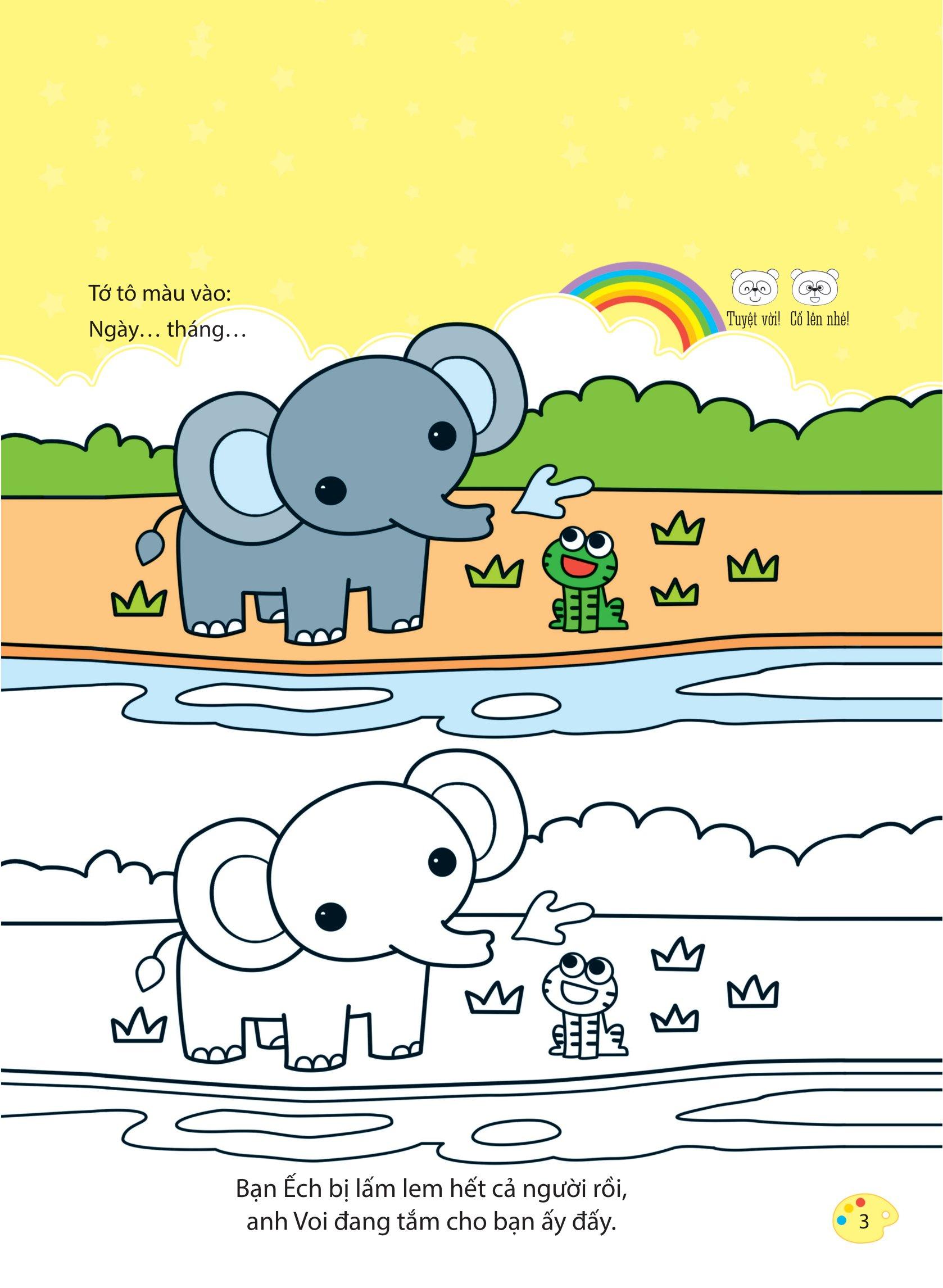 Ngoài việc tô màu theo sự sáng tạo riêng của mỗi bé, sách có gợi ý màu sắc, hình tô mẫu để các bé có thể dễ tưởng tượng và ghi nhớ được hình dạng và màu sắc.