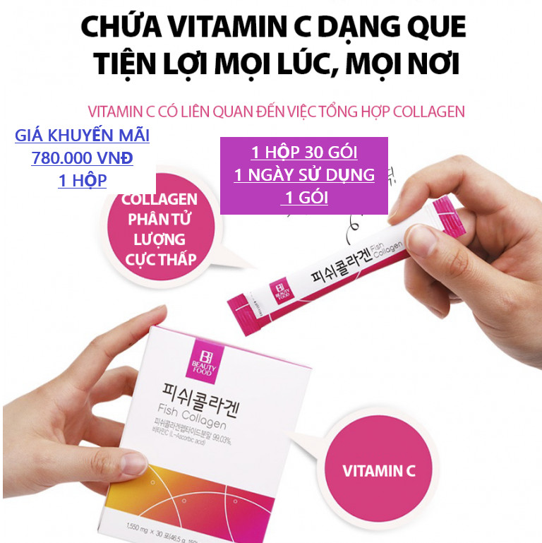 **BEAUTY FOOD - FISHCOLLAGEN CAO CẤP TỪ HÀN QUỐC Là sản phẩm collagen chiết xuất từ vảy cá, mang lại tác dụng gấp 7 lần so với collagen từ động vật.   Ở độ tuổi 18, 20 khi, lượng collagen trong cơ thể ở mức ổn định và đầy đủ nên chúng ta có một làn da căng mịn, hồng hào. Nhưng theo thời gian, lượng collagen này sẽ giảm dần và đến một lúc nào đó làn da của bạn bắt đầu sạm đi, đó là dấu hiệu cho biết collagen trong cơ thể đã không còn đủ để đáp ứng các nhu cầu của cơ thể. Theo nghiên cứu, bắt đầu từ tuổi 25 trở đi, mỗi năm cơ thể sẽ mất khoảng từ 1 -1.5% lượng collagen tự nhiên.     Lúc này, bổ sung collagen là cách duy nhất để “cứu” làn da khỏi nguy cơ lão hoá sớm, để tăng độ đàn hồi cho da. Bổ sung collagen còn là cách giúp kích hoạt khả năng tái tạo collagen tự nhiên của cơ thể. Sự sản xuất mới của collagen sẽ giúp loại bỏ các vết thâm sạm, các đốm tàn nhang và đốm nâu trên da, do tác động của tia cực tím và môi trường sống ảnh hưởng đến làn da.   THÀNH PHẦN: Trong mỗi gói 1550 mg có chứa: Bột fishcollagen peptide: 99,03%(1535 mg), Vitamin C (L-Ascorbic axit): 0,97%(15mg)   CÔNG DỤNG: Collagen là yếu tố cần thiết trong quá trình tạo ra các axit amin thanh khiết cho sức khỏe của làn da, mái tóc, móng tay, khớp xương và các mô khác trên cơ thể người.