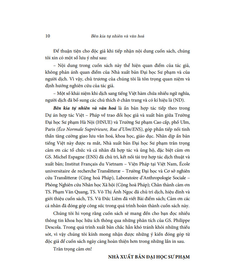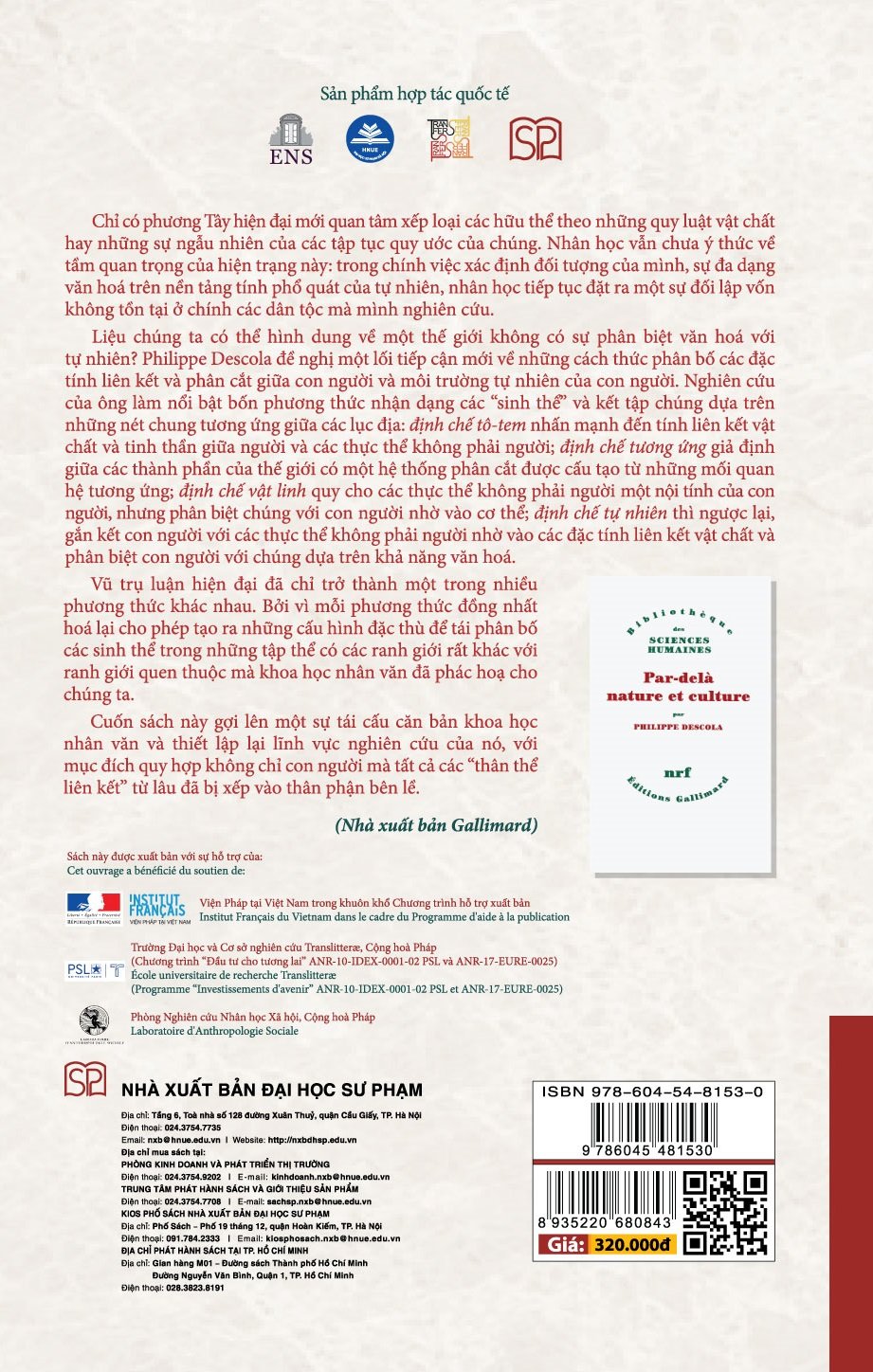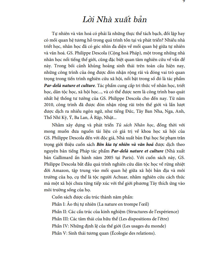 Nhằm xây dựng và phát triển Tủ sách Nhân học, đồng thời với mong muốn đưa nguồn tài liệu có giá trị về khoa học xã hội của GS. Philippe Descola đến với độc giả, Nhà xuất bản Đại học Sư phạm trân trọng giới thiệu cuốn sách Bên kia tự nhiên và văn hoá được dịch theo nguyên bản tiếng Pháp tác phẩm Par-delà nature et culture (Nhà xuất bản Gallimard ấn hành năm 2005 tại Paris).