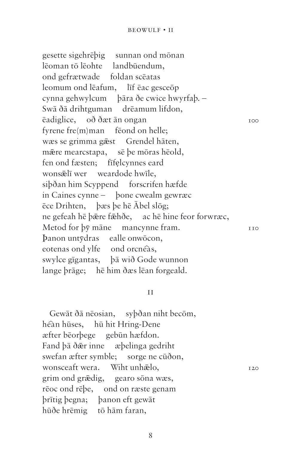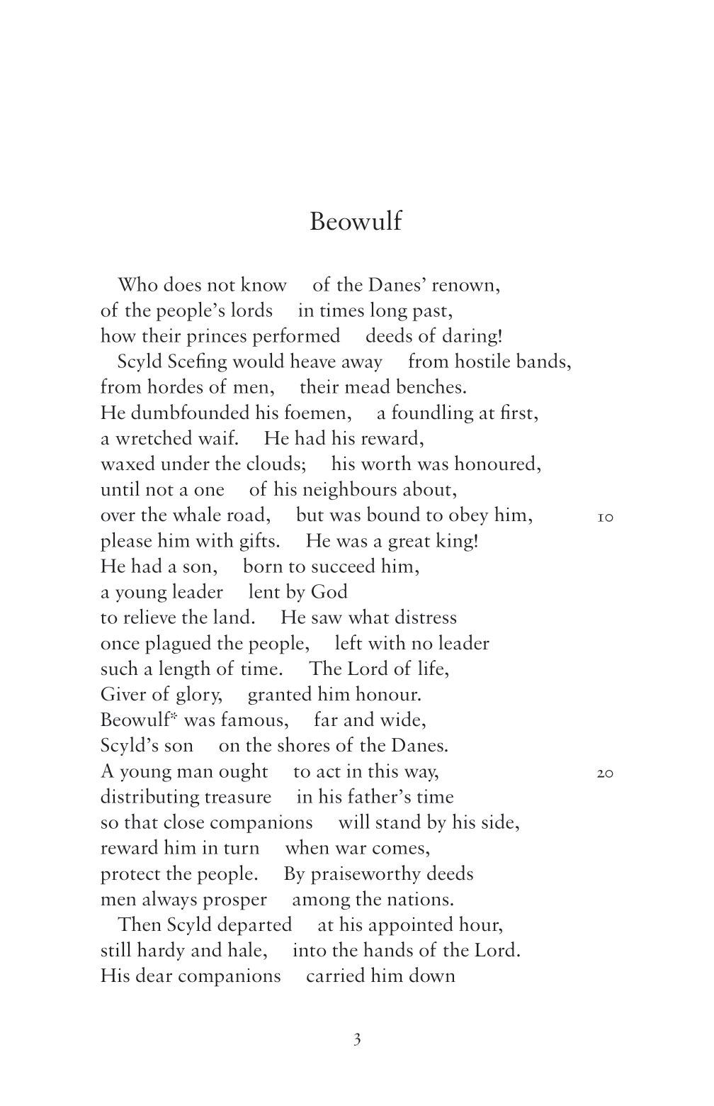 Of unknown date, and surviving in a tenth-century manuscript, Beowulf is the tale of a young Geatish hero and his struggle with three deadly foes, beginning with the dread monster Grendel, who has been devouring warriors in the hall of the Danish King in their sleep.