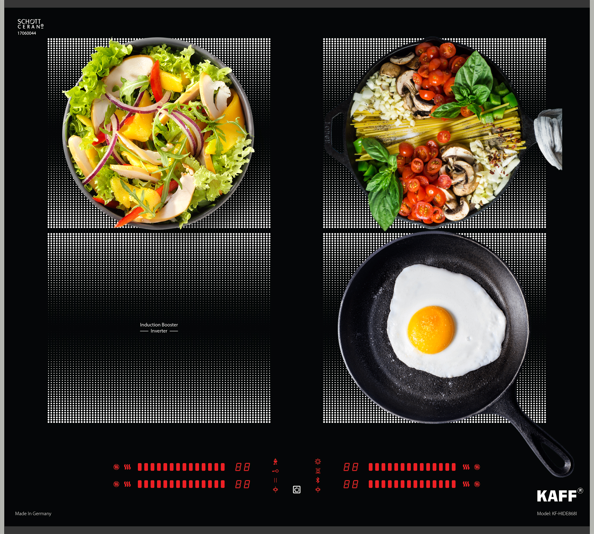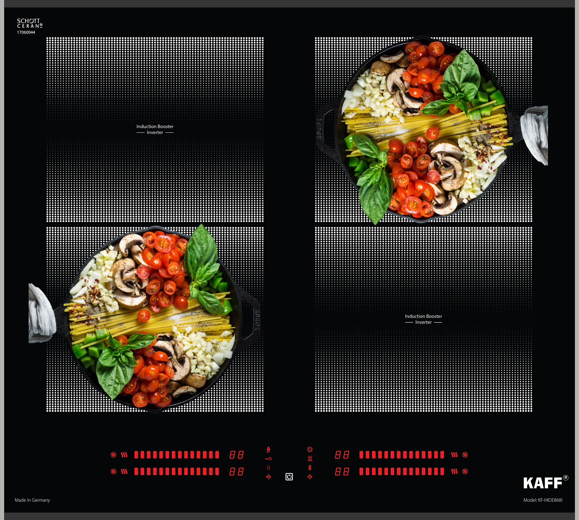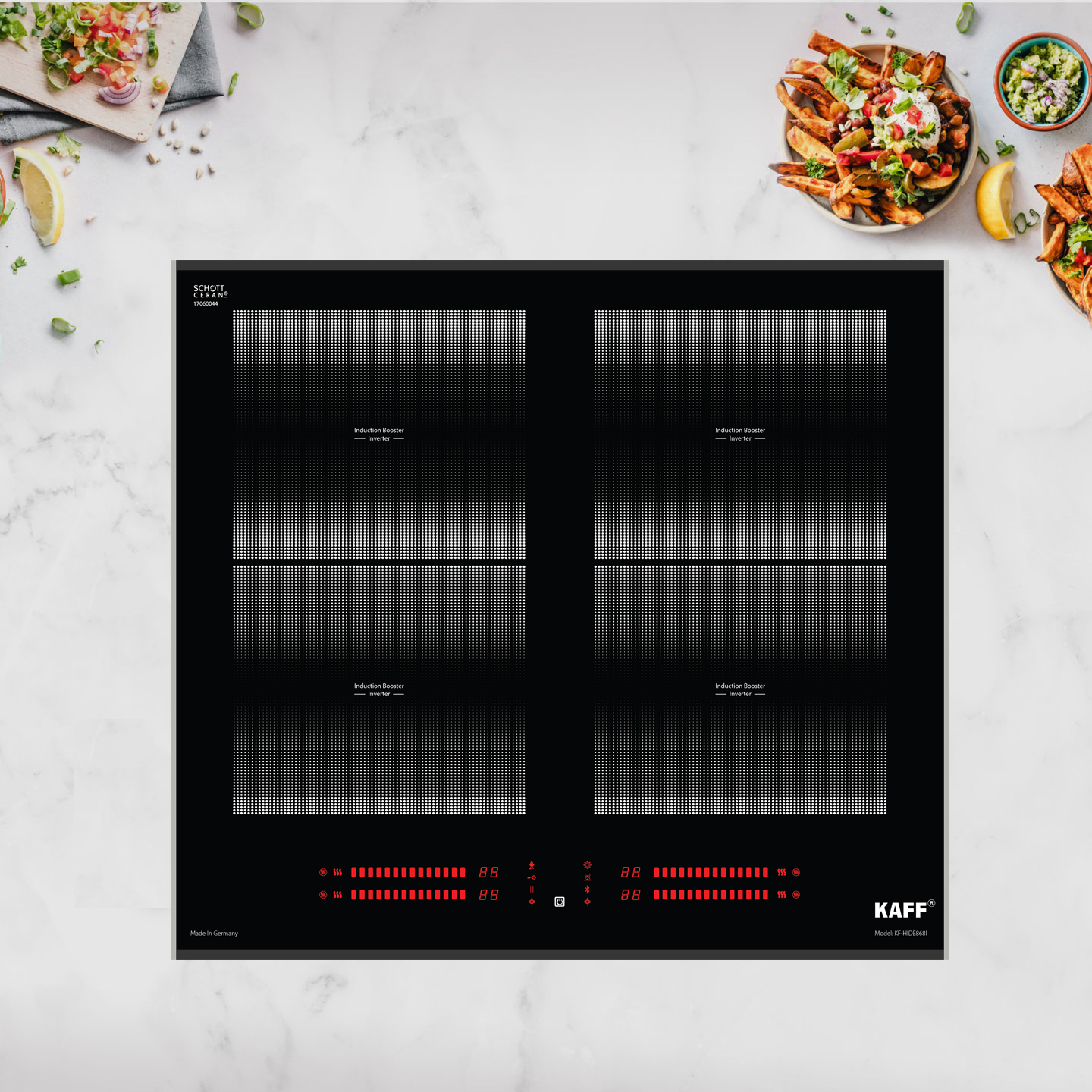 Mã sản phẩm: KF-HIDE868I THÔNG SỐ KỸ THUẬT • Bếp đa điểm 04 từ • Mặt kính Schott Ceran Made in Germany siêu bền, chịu lực chịu sốc nhiệt • Bo mạch EGO Made in
