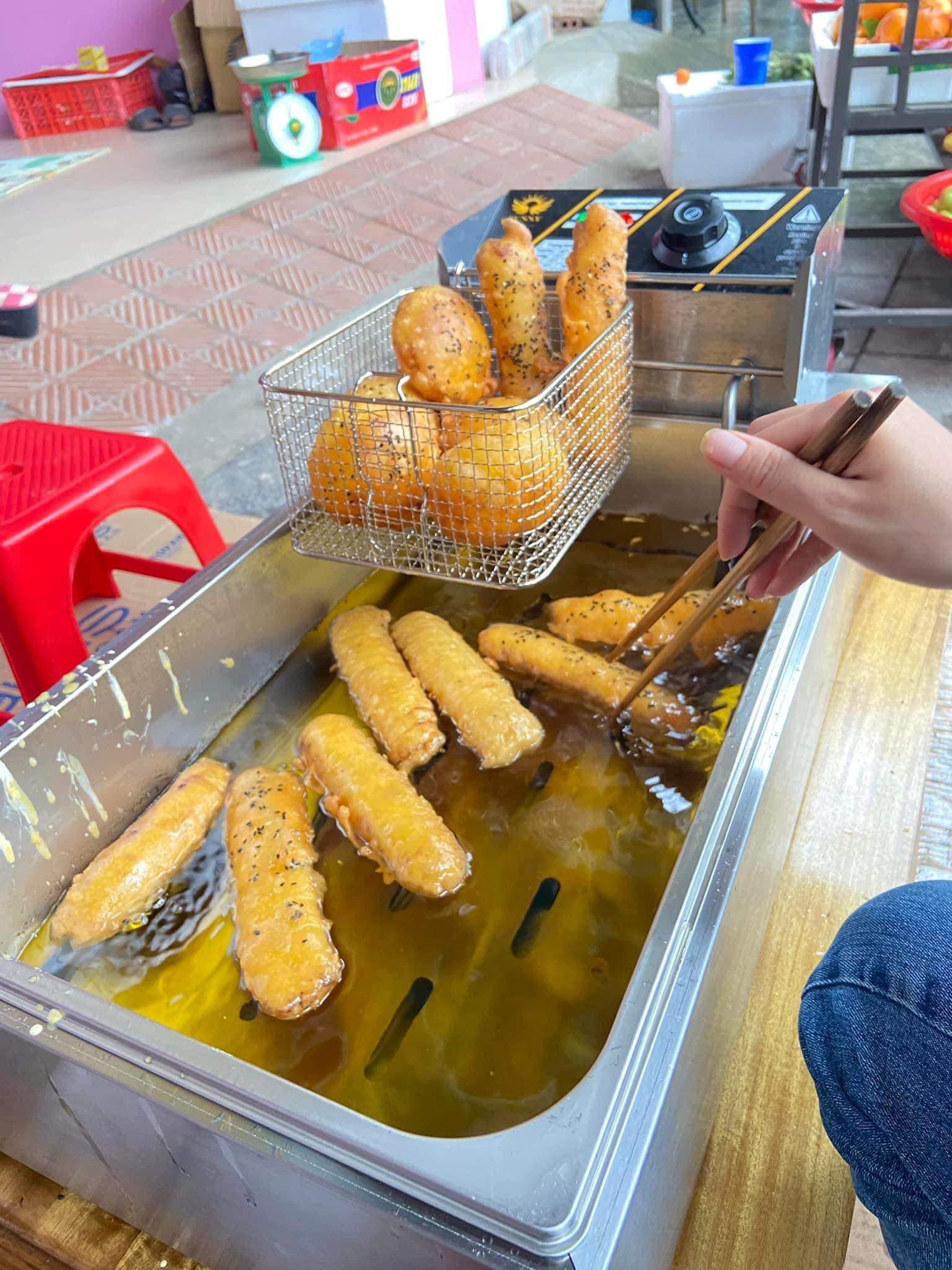 - Bước 2: Cho thực phẩm/nguyên liệu vào rổ chiên để nhúng dầu. Đậy nắp nếu không muốn bị dầu bắn ra ngoài