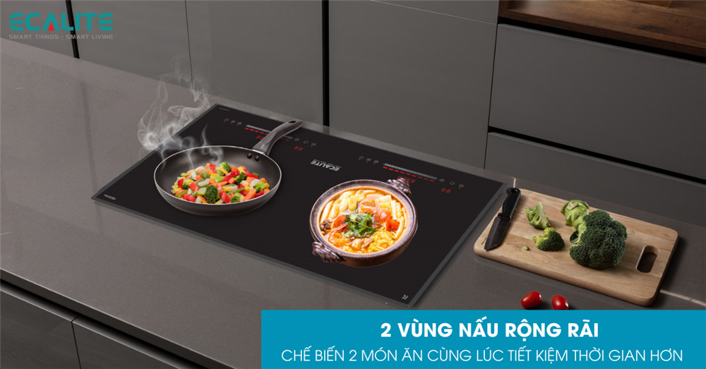 Để đáp ứng tốt cho nhu cầu nấu ăn của gia đình 3-5 thành viên, hãng thiết bị nhà bếp Ecalite trang bị cho sản phẩm 2 vùng nấu riêng biệt. Nhờ đó, bạn có thể chế biến cùng lúc 2 món ăn để tiết kiệm thời gian hơn mà không cần phải chờ đợi như bếp đơn, chẳng hạn như vừa có thể nấu canh vừa nấu món kho để kịp chuẩn bị bữa ăn cho gia đình. Khoảng cách 2 vùng nấu thiết kế hợp lý giúp nồi nấu không quá sát và va chạm vào nhau tạo sự thoải mái cho thao tác của người nội trợ. Song song đó, 2 vùng nấu cũng có đặc điểm là không kén nồi nên bạn có thể đặt nồi niêu, thuỷ tinh, nhôm, inox, lên bếp để nấu mà không cần phải mua nồi đáy inox thích hợp như bếp từ.