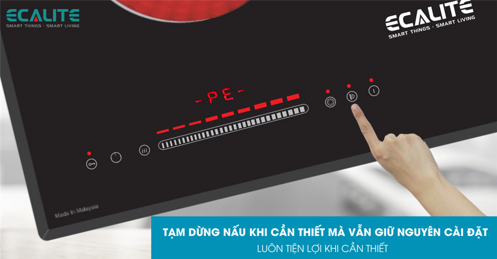 Đa số các mẫu bếp điện từ hãng Ecalite đều có chức năng tạm dừng nấu, và mẫu bếp EL-MK271R cũng không ngoại lệ. Khi có việc đột xuất lúc đang nấu ăn và bạn không thể canh chừng bếp được, hãy chạm vào biểu tượng "tạm dừng" và mặt bếp sẽ hiển thị ký hiệu "-PE-" (viết tắt của Pause). Lúc này bếp sẽ ngưng gia nhiệt nhưng vẫn sẽ lưu lại các cài đặt hiện có như công suất, hẹn giờ, bật/tắt vòng nhiệt, Khi cần tiếp tục nấu trở lại, bạn chỉ cần chạm lại biểu tượng "tạm dừng" một lần nữa và bếp sẽ gia nhiệt đúng với các tuỳ chọn trước đó.