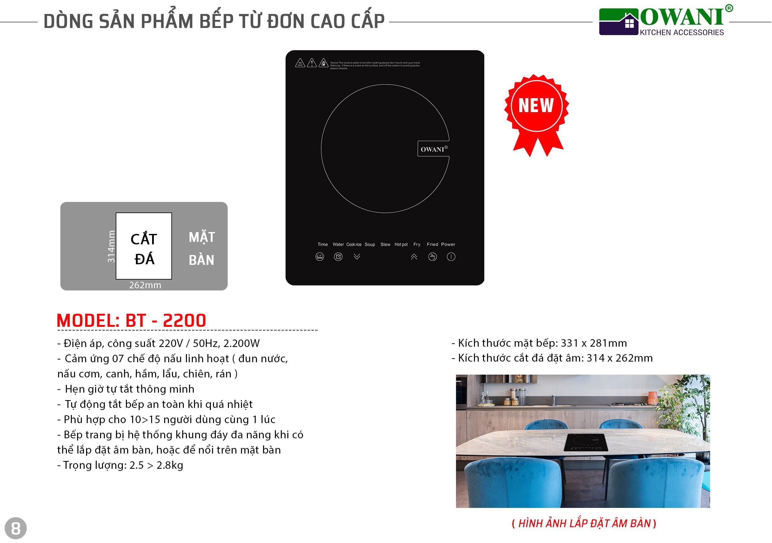 Xu hướng trang trí nhà bếp hiện đại đang hướng đến sự tối giản, tinh tế nên không thể thiếu các thiết kế bếp điện lắp âm như Bếp Điện Từ Đơn Cảm Ứng Đặt Âm OWANI BT-2200 - Hàng Chính Hãng, vừa tiết kiệm diện tích vừa mang lại không gian mở cho căn bếp nhà bạn.