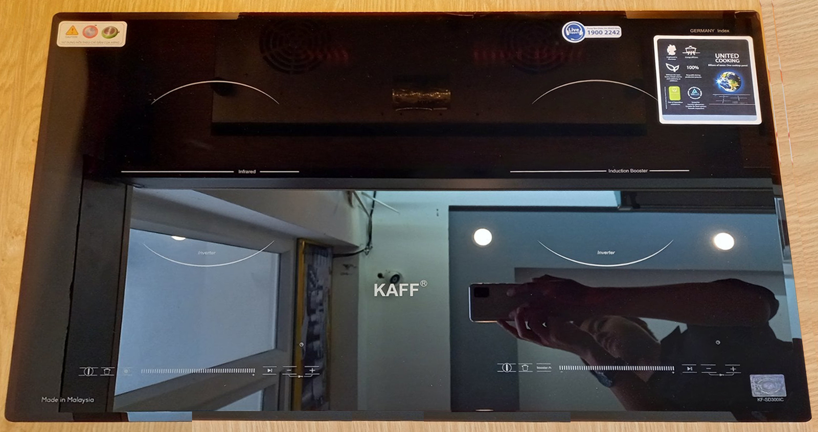 BẾP ĐIỆN TỪ KAFF KF-SD300IC | NHẬP KHẨU NGUYÊN CHIẾC TỪ MALAYSIA | THIẾT KẾ SANG TRỌNG | HỆ ĐIỀU KHIỂN CẢM ỨNG SLIDER CONTROL SIÊU NHẠY | AN TOÀN, BỀN BỈ VÀ TIẾT KIỆM ĐIỆN NĂNG   Bếp điện từ Kaff KF-SD300IC sử dụng mặt kính Crystal sản xuất tại Malaysia, mặt kính được làm từ chất liệu gốm thủy tinh có khả năng chịu nhiệt lên đến 1000°C, kháng sốc 750°C. Bề mặt kính chịu nóng lạnh cũng như sự thay đổi đột ngột của nhiệt độ. Độ giãn nở vì nhiệt thấp nên bếp hoạt động rất hiệu quả và cách nhiệt. Mặt bếp tản nhiệt nhanh và được cách điện an toàn với các linh kiện điện tử bên trong thân. Bạn có thể yên tâm sử dụng mà không lo bị bỏng hay điện giật.   Đây là mặt kính chuyên dụng dành cho bếp điện từ, là một loại kính có chất lượng cao, rất cứng, bền và có nhiều đặc điểm nổi trội như: khả năng chịu nhiệt, khả năng chống trầy xước và chống va đập Mặt kính gồm các thấu kính hội tụ, truyền nhiệt từ bếp lên đáy nồi theo phương thẳng đứng, không thất thoát nhiệt ra môi trường. Mặt kính màu xám liền nguyên khối, an toàn, thẩm mỹ và tiện trong việc vệ sinh, lau chùi.   Bếp điện từ Kaff KF-SD300IC gồm 2 vùng nấu với tổng công suất 4200W, vùng nấu từ phải có công suất là 2000W khi kích hoạt tính năng nấu nhanh Booster công suất lên tới 3500W, vùng nấu hồng ngoại trái trang bị mâm nhiệt cao cấp E.G.O Hilight với 02 vòng nhiệt có công suất tối đa 2200W. Chỉ trong chốc lát sau khi kích hoạt tính năng này, nhiệt lượng trên vùng nấu từ tăng lên công suất tương đương với mức nhiệt lượng lớn nhất. Do đó, các món ăn được nấu chín nhanh hơn, tiết kiệm thời gian vào bếp cho chị em nội trợ. Chức năng Booster nấu siêu nhanh, tuy nhiên thời gian tối đa mặc định dùng chức năng này là 10 phút / lần tránh quá tải.   Bếp điện từ Kaff KF-SD300IC được trang bị với công nghệ Inverter thông minh vượt trội giúp làm giảm lượng tiêu thụ điện của các sản phẩm có sử dụng lõi từ của bếp từ. Ngoài ra công nghệ Inverter còn giúp bếp từ điều chỉnh mức công suất phù hợp để không làm tiêu thụ nhiều điện năng. Bếp điện từ Kaff KF-SD300IC với cảm biến thông minh sẽ cố định công suất tiêu thụ điện khi đun nấu, không bật tắt liên tục như các bếp từ thông thường khác (tự động điều chỉnh liên tục để đảm bảo mức nhiệt tương đương bằng với con số hiển thị trên bàn điều khiển).   Bạn có thể tận dụng các loại xoong, nồi vì bếp điện không kén nồi, phù hợp với nhiều kích cỡ. Ưu điểm của bếp điện hơn hẳn các sản phẩm khác là có thể nướng trực tiếp lên bề mặt. Nướng thịt, rau củ, hải sản thơm ngon. Bạn nên vệ sinh sạch sẽ mặt bếp sau khi sử dụng. Hoạt động của bếp điện là truyền nhiệt lên mặt kính rồi mới lên đáy nồi nên mặt kính bếp rất nóng. Sau khi nấu, bạn có thể tận dụng hâm nóng thức ăn trên bếp. Ngược lại với vùng điện, bếp từ chỉ hơi nóng vùng nấu. Hiệu suất nấu lên tới 90%. Chức năng nhận diện vùng nấu chỉ sinh nhiệt vùng đáy nồi, tránh nồi thất thoát nhiệt ra ngoài.   Bếp điện từ Kaff KF-SD300IC được tích hợp chức năng tự nhận diện vùng nấu, khi ta đặt nồi lên 1 trong 2 vùng nấu sau đó ấn nút khởi động bếp sau thời gian 1-2 giây bếp sẽ tự động tìm vùng nấu đã có nồi, ta chỉ việc điều chỉnh mức công suất to nhỏ theo ý muốn mà không phải thao tác chọn vùng nấu như bếp thông thường. Công nghệ Inverter được áp dụng trên Bếp điện từ Kaff KF-SD300IC có khả năng phản ứng thay đổi công suất theo điều khiển ngay tức thì, khi người dùng điều chỉnh tăng giảm nhiệt độ đun nấu, bếp điều chỉnh thay đổi tức thì về mức nhiệt độ mong muốn.   Bếp điện từ Kaff KF-SD300IC sử dụng bảng điều khiển cảm ứng dạng trượt Slider Control hiện đại với 9 cấp độ công suất nhiệt độ khác nhau, điều khiển dễ dàng bằng một ngón tay, mọi chương trình nấu đều được hiển thị qua đèn Led sắc nét để bạn điều chỉnh cho phù hợp với các món ăn. Bếp còn được trang bị thêm các chức năng nấu thông minh như tạm dừng và hâm nóng.   Chức năng tạm dừng và ghi nhớ chương trình Pause & Recall: Tạm dừng bếp khi đang đun nấu, sau đó ta tiếp tục đun nấu trở lại bằng việc nhấn vào thanh trượt Slider hoặc phím Pause, bếp sẽ hoạt động trở lại đúng cài đặt trước đó khi được khởi chạy trở lại.   Chức năng ủ ấm “hâm nóng”: Với công nghệ biến tần Inverter vượt trội, Bếp điện từ Kaff KF-SD300IC có khả năng ủ ấm ở nhiệt độ nhất định, chức năng ủ ấm được lập trình giữ mức nhiệt độ ổn định giúp chúng ta duy trì nhiệt cho thức ăn luôn nóng mà không bị nguội đi phải đun lại nhiều lần làm giảm chất dinh dưỡng trong thức ăn, đặc biệt về mùa đông thời tiết lạnh.   Phần thân vỏ của Bếp điện từ Kaff KF-SD300IC sử dụng chất liệu thép ch